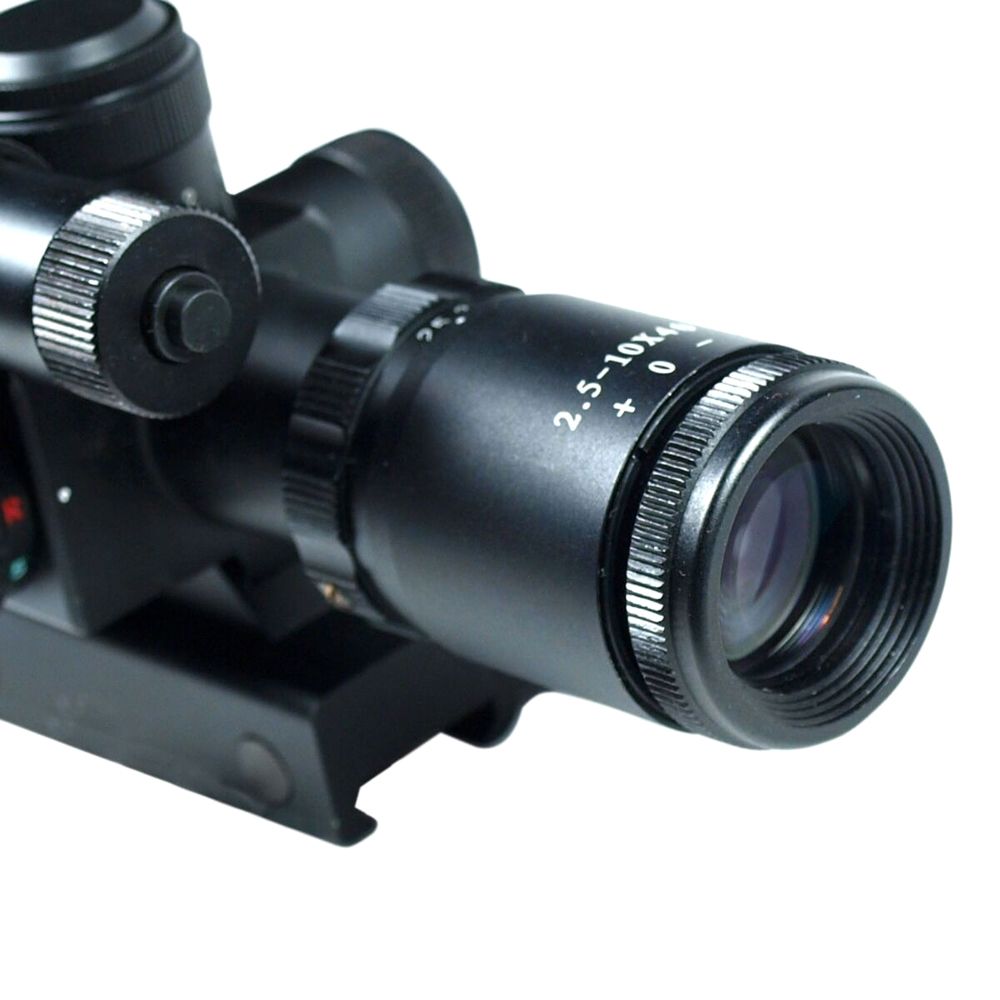 Magnification: 2.5-10XTube Diameter: 25.4mm (1 in)Objective Diameter: 40mmField of View (at 100 yds): 82.5 cm - 22.6 cm (32.5 in - 8.9 in)Eye Relief: 101.6 mm - 76.2 mm (4 in - 3 in)Exit Pupil: 16 mm - 4 mm (0.63 in - 0.16 mm)Brightness Control: Red: 5 levels / Green: 5 levelsLength: 198 mm (7.8 in)Weight: 563 g (1.2 lb)Laser Power: 5mWLaser Frequency: 532nmPower: 1 x CR2032 (illumination) / 1 x CR123 (laser)