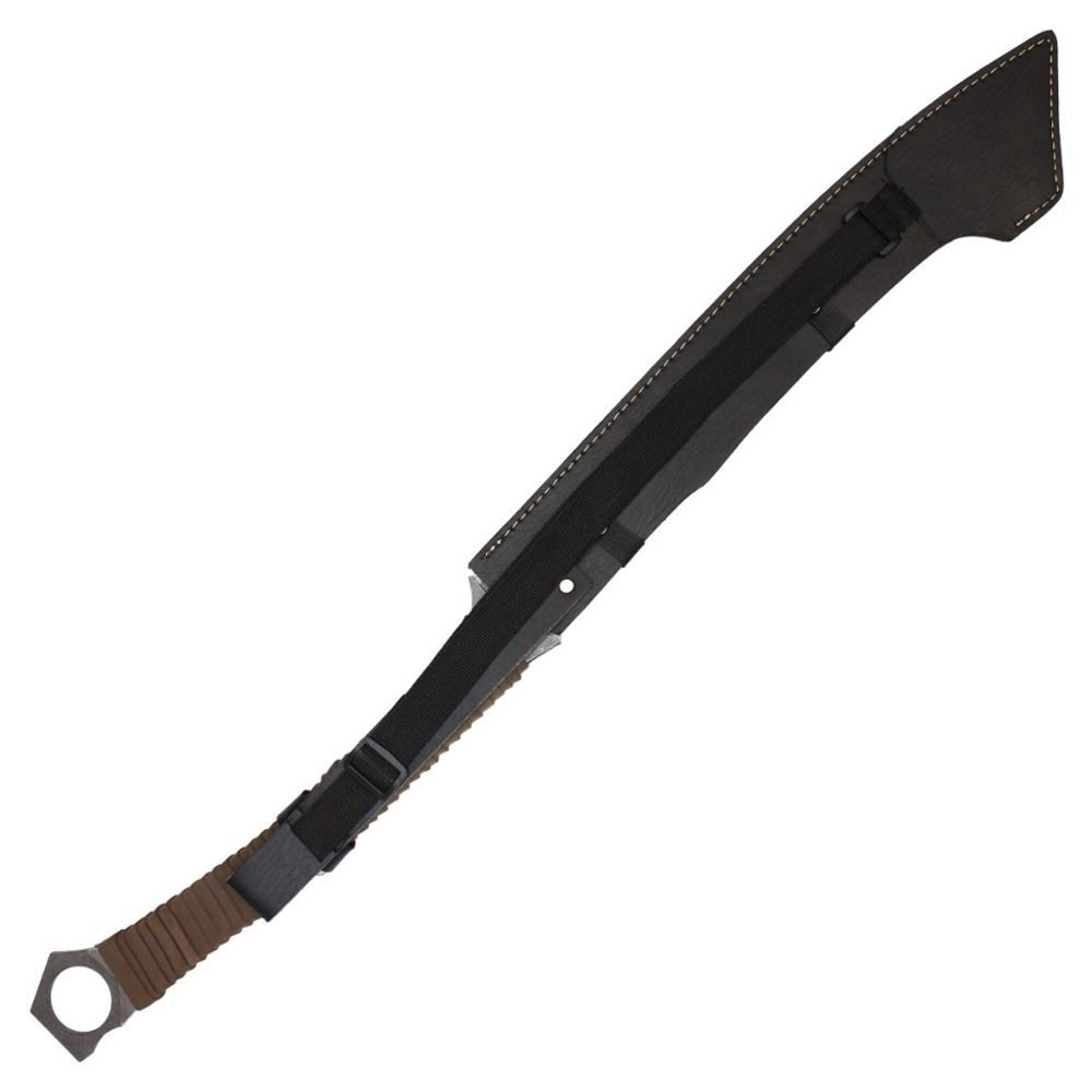 Finally, this tactical sword comes with a leather scabbard. The black scabbard secures the sword in place with snap straps. It has a shoulder carrying strap. The Manganese Steel Cleaver Sword is functional for battles and reenactments. It looks great added to a collection.