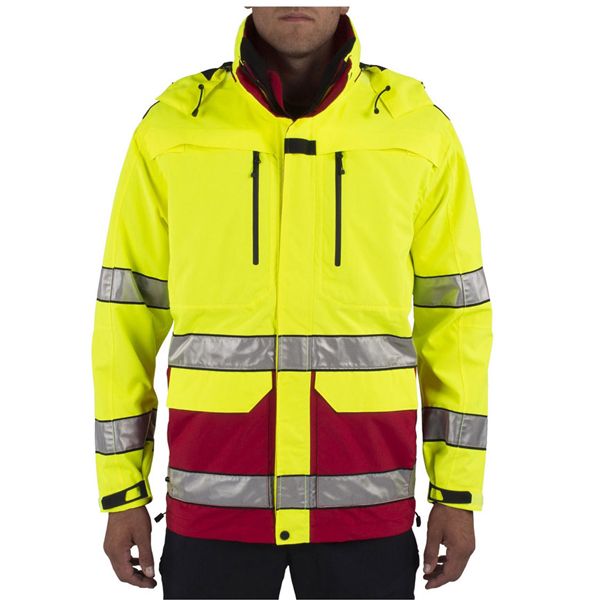 The First Responder Hi-Vis Jacket delivers superior all-weather protection in a versatile design. Seam-sealed and waterproof, the jacket features storm flaps, adjustable cuffs, and a storable hood to keep you dry. The Quixip System allows enhanced ventilation or rapid access to a sidearm, while a removable softshell liner with detachable sleeves capably serves as your backup jacket or vest. 3M Scotchlite reflective tape and distinctive coloration promote visibility, and hand-warmer pockets and chest pockets add utility. Be ready, be visible. Be the best.