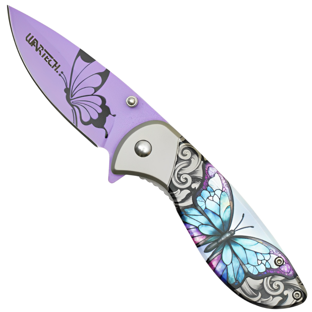 Turn Heads And Slice With Precision Using This Stunning Butterfly Print Pocket Knife. Featuring A 3" Sharp Steel Blade With Matching Butterfly Art And A 4" Gray Handle With Eye-Catching Detailing, It’s Perfect For Everyday Carry With Personality. Lightweight, Durable, And Stylish – This Knife Is The Ideal Blend Of Beauty And Utility!
