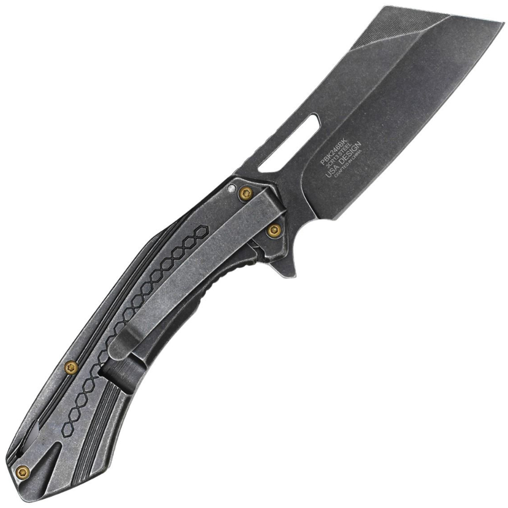 The Buckshot Mini Cleaver Folder features a 3.25" cleaver blade. It has a blade flipper opener. This framelock has aluminum handles with brass hardware, tip-up pocket clip, and a lanyard hole. It's 4.50" closed, 7.75" overall, and weighs 5.4oz.