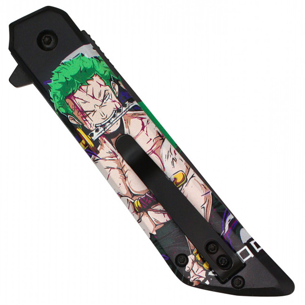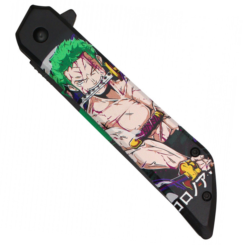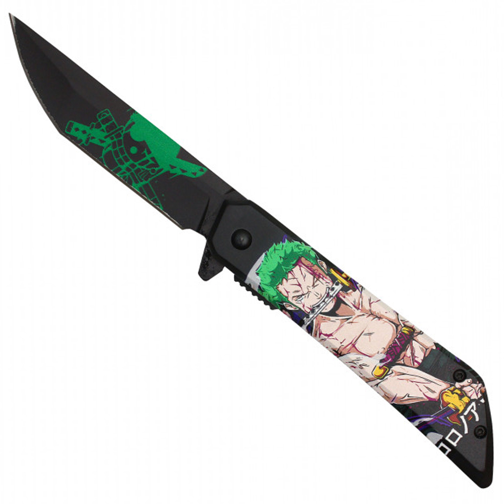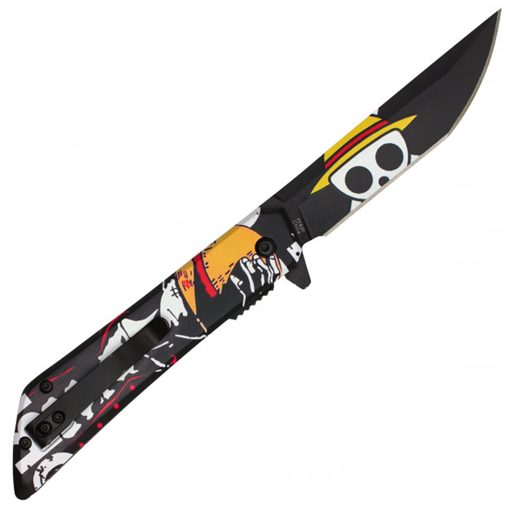 A sleek pocket knife featuring a bold design inspired by legendary characters. The Black One Piece Pocket Knife combines functionality with style, offering a sharp steel blade and a comfortable grip.