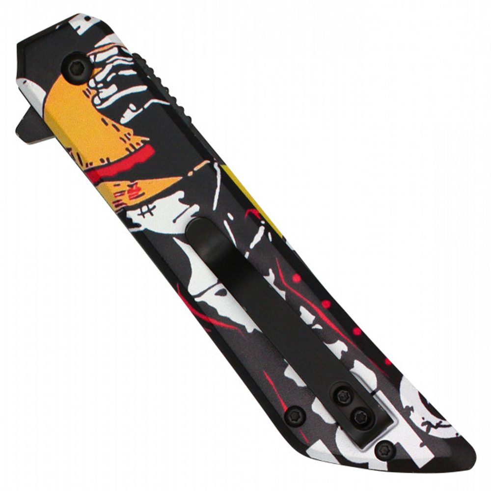 The black graphic blade ensures a striking look, while the durable handle provides a secure hold. Designed for everyday convenience, it includes a belt clip for easy carry.