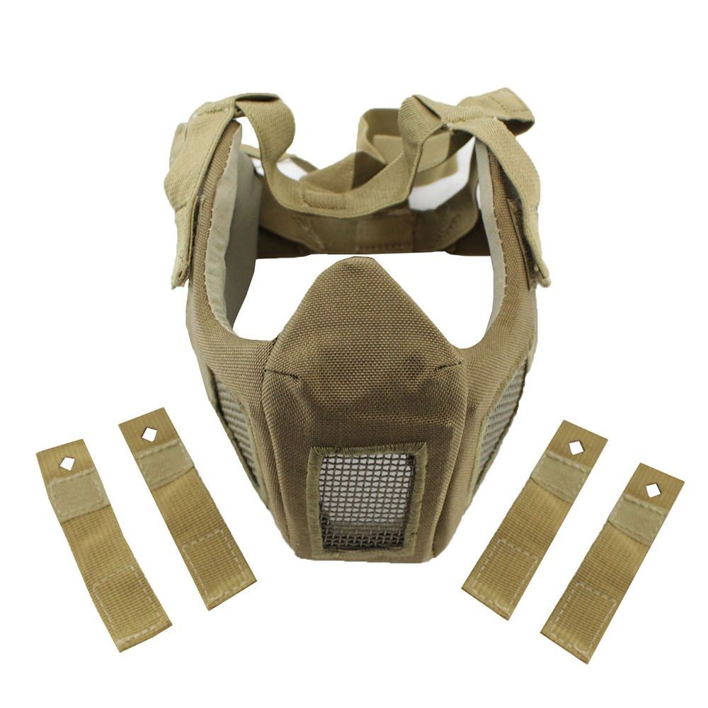 Protect your face on the field with this tactical half mask. The heavy duty nylon canvas has five built in steel mesh ventilation pads that will keep you cool under fire. A flexible frame and elastic headband ensure a secure grip on any head size. The package includes hook and loop straps for helmet integration. Desert tan fabric provides camouflage in arid and urban environments.