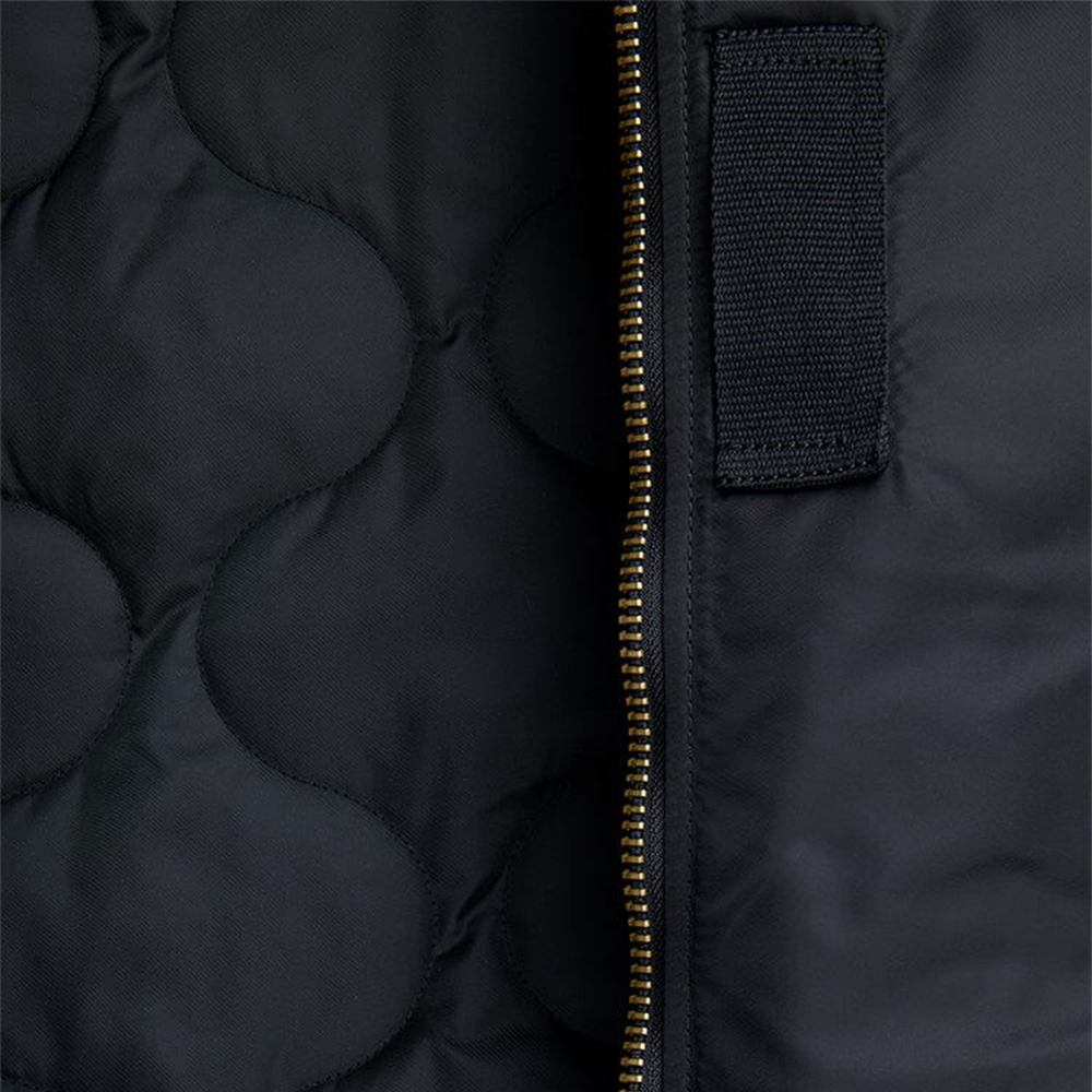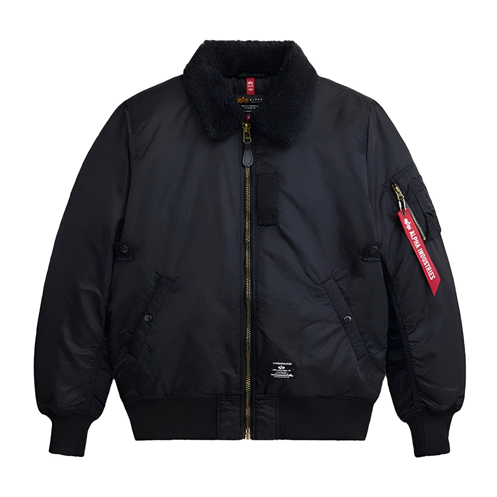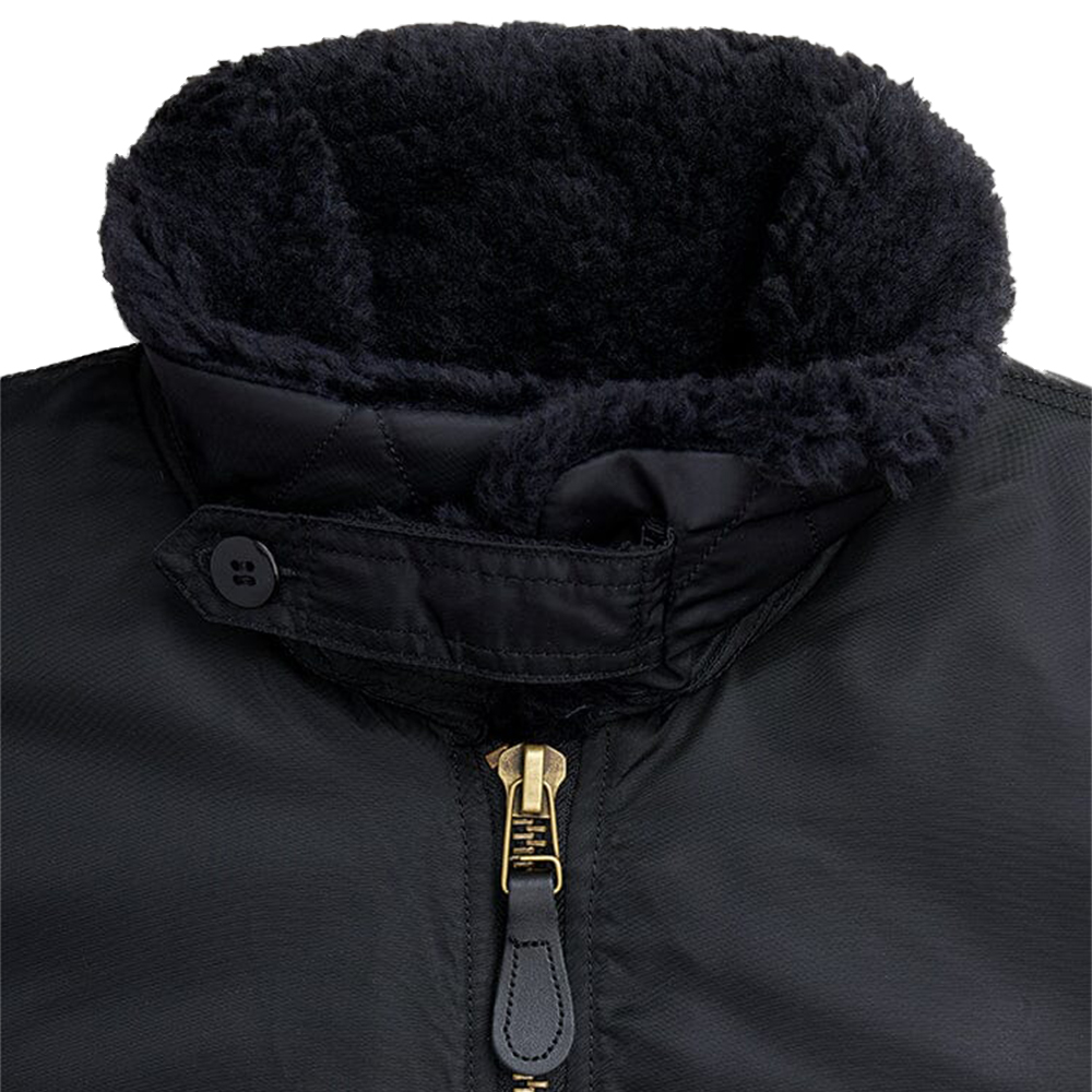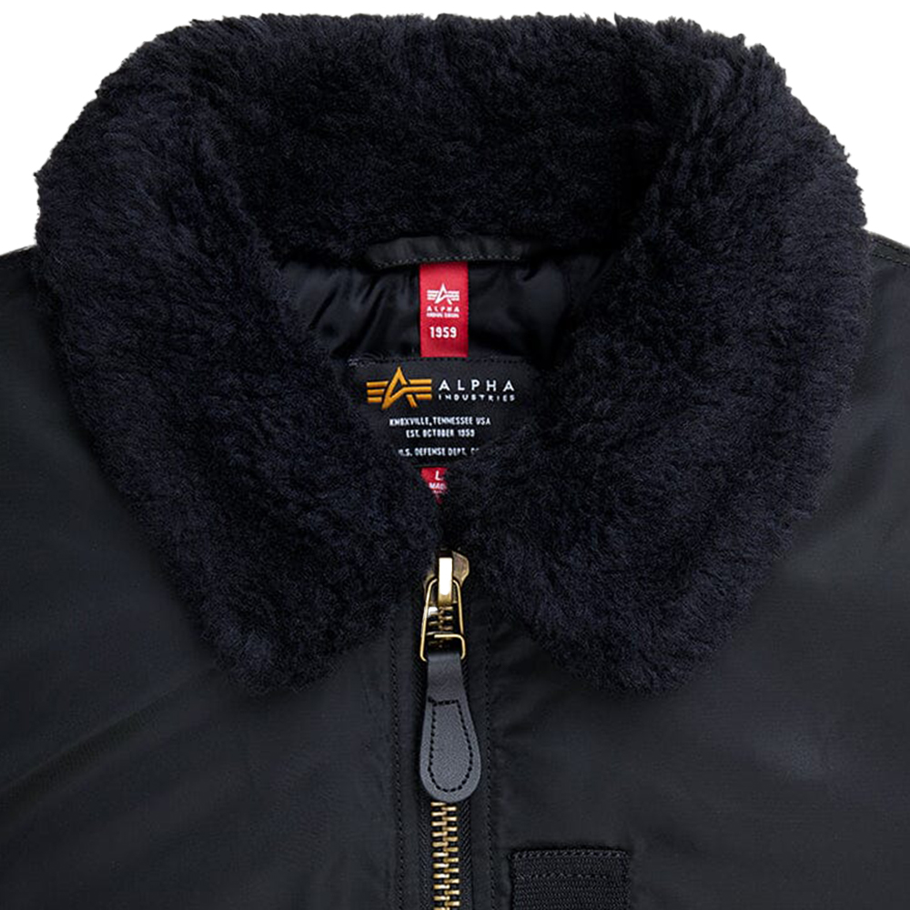 A plush faux mouton collar adds both insulation and a distinctive visual signature, enhancing comfort during cooler conditions while reinforcing the jacket’s authentic flight-inspired character. Signature details such as the nylon oxygen tab and the MA-1 utility sleeve pocket with the recognizable Alpha red ribbon highlight its aviation roots. Inside, a quilted nylon twill lining with insulation provides reliable warmth and comfort, making this jacket well suited for intermediate weather.