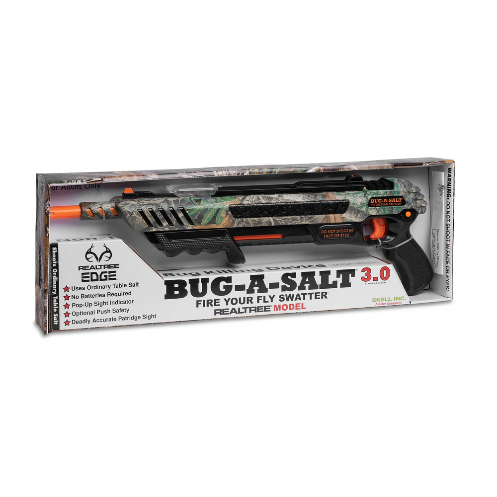 The Bug-A-Salt 3.0 in Realtree Camo is the ultimate backyard tactical tool for serious fly-hunters. Packed with precision upgrades and styled in rugged Realtree camouflage, this salt-powered blaster turns pest control into sport.
