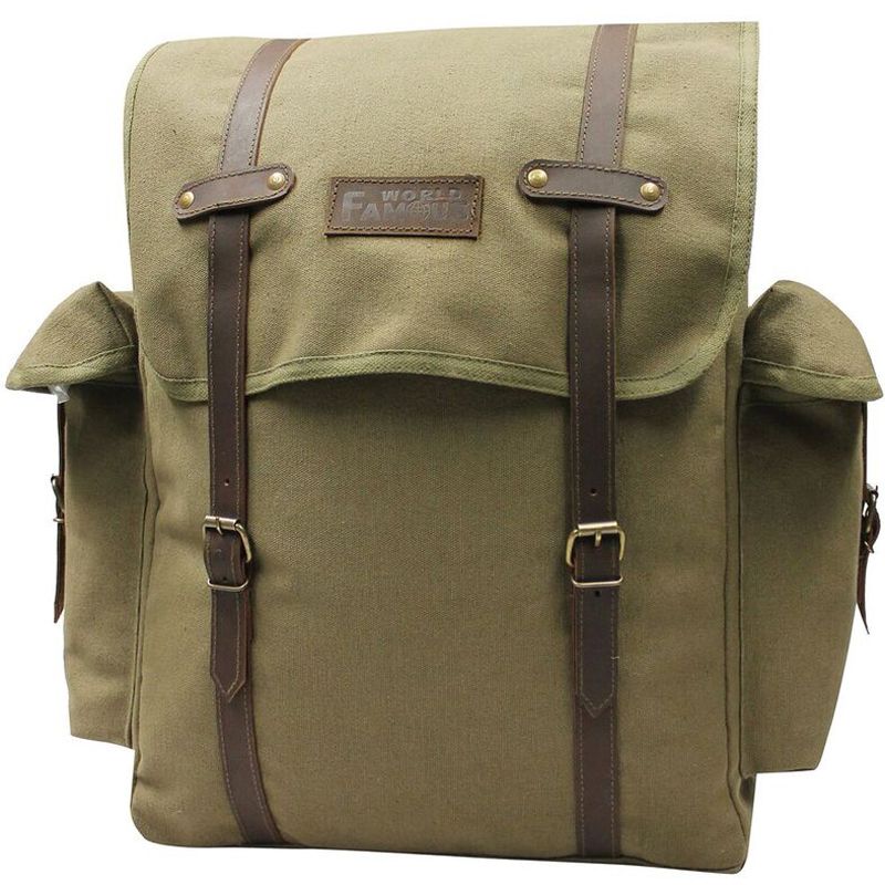 Embrace vintage style with the Canvas and Leather Laptop Backpack. Durable canvas construction is combined with genuine leather straps and a large flap top. This distinct retro design is combined with ultra strong tear resistant construction. In addition to a large inner compartment and two external side pockets, this bag features a padded laptop compartment. The straps are wide, foam padded, and adjustable for comfortable carry.