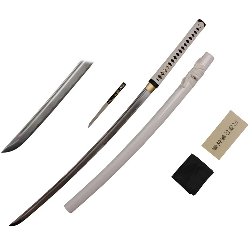 The handle is wrapped in genuine ray skin, providing a secure grip for handling. A hidden knife adds an extra layer of versatility, while the zinc alloy-plated tsuba enhances its overall design. Available in multiple configurations, including options with or without a tsuba, this katana comes complete with a saya, a sword bag, and a certificate.