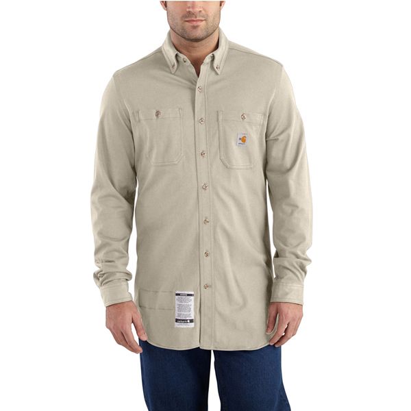 Long-lasting, 6.75-ounce, 100% cotton FR jersey knit remains durable & comfortable with every wash FastDry technology wicks away sweat for comfort so you can stay focused on your day Fights odors: traps and releases them in the wash Side-seamed construction minimizes twisting and maximizes comfort Extended sleeve plackets with two-button adjustable cuffs, FR melamine buttons throughout Carhartt logo and NFPA 2112/PPE Category Rating labels sewn to exterior