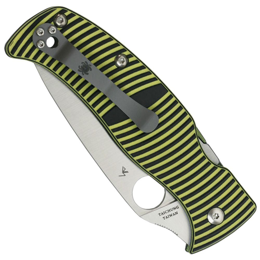 One of the latest and most stylish additions to Spyderco’s growing Salt Series of knives, the Caribbean is unique in several ways. Its full-flat-ground, leaf-shaped blade is precision machined from LC200N-a nitrogen-based martensitic steel that holds and edge extremely well and is completely rustproof. Available with either a PLain Edge or fully serrated Spyder Edge, the blade is housed in a vibrantly colored handle featuring scales crafted from layered black and yellow G-10. The intricately machined pattern on the scales not only creates a non-slip texture, it reveals the contrasting colors of the layers to create a stunning striped design. Skeletonized stainless steel liners nested within the scales anchor the knife’s high-strength Compression Lock mechanism, while a reversible titanium hourglass clip offers convenient left or right-side tip-up carry.