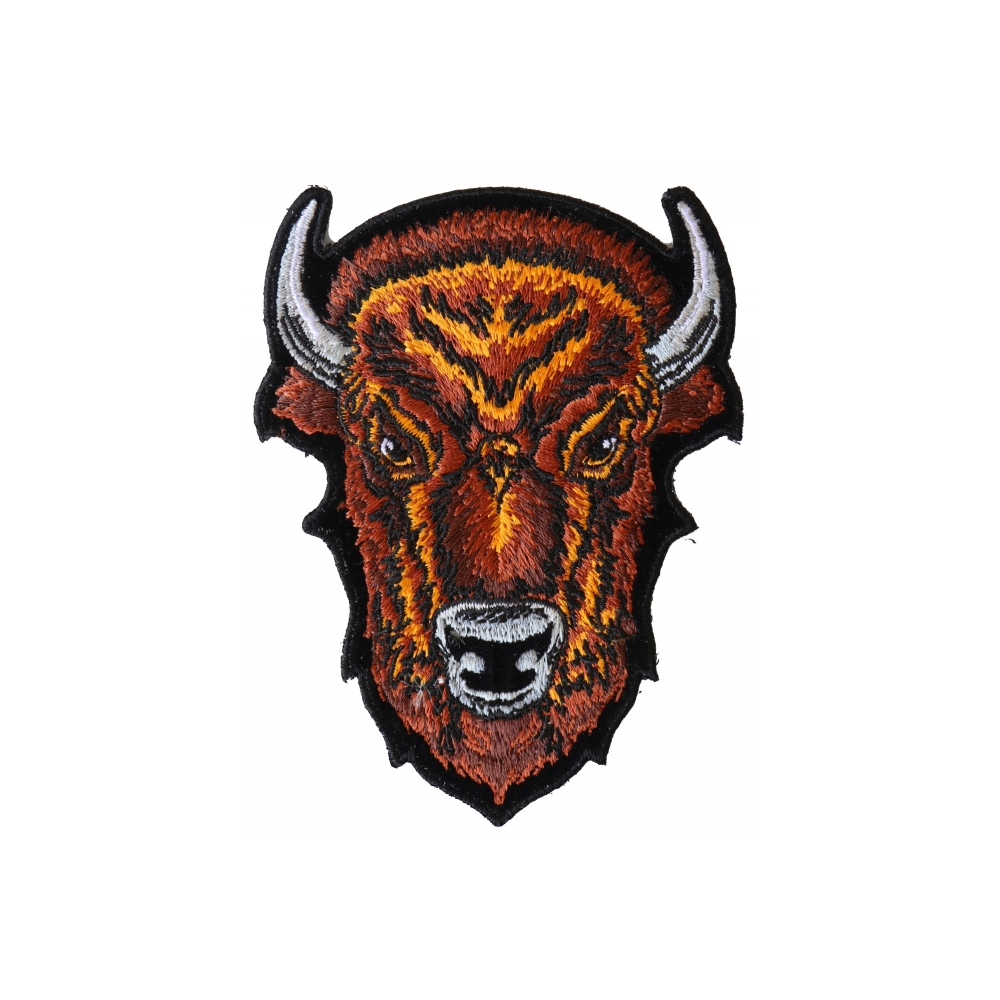 Buffalo Head Small Patch measures 3x4 inches and is Embroidered in Black / Brown / Gray. The Small Patch can be sewn on or ironed onto clothing. This Buffalo Head Patch design is a smaller version of an old design we've been making for years. We used to have it as a large back patch which can still be specially ordered but we no longer keep it in stock. This buffalo head patch is embroidered in many different shades of brown to give it a very nice texture effect. It is now a nice and small size that can fit in more places than before.