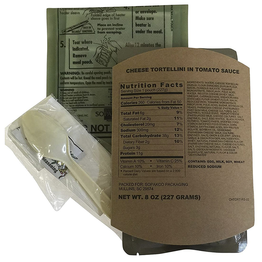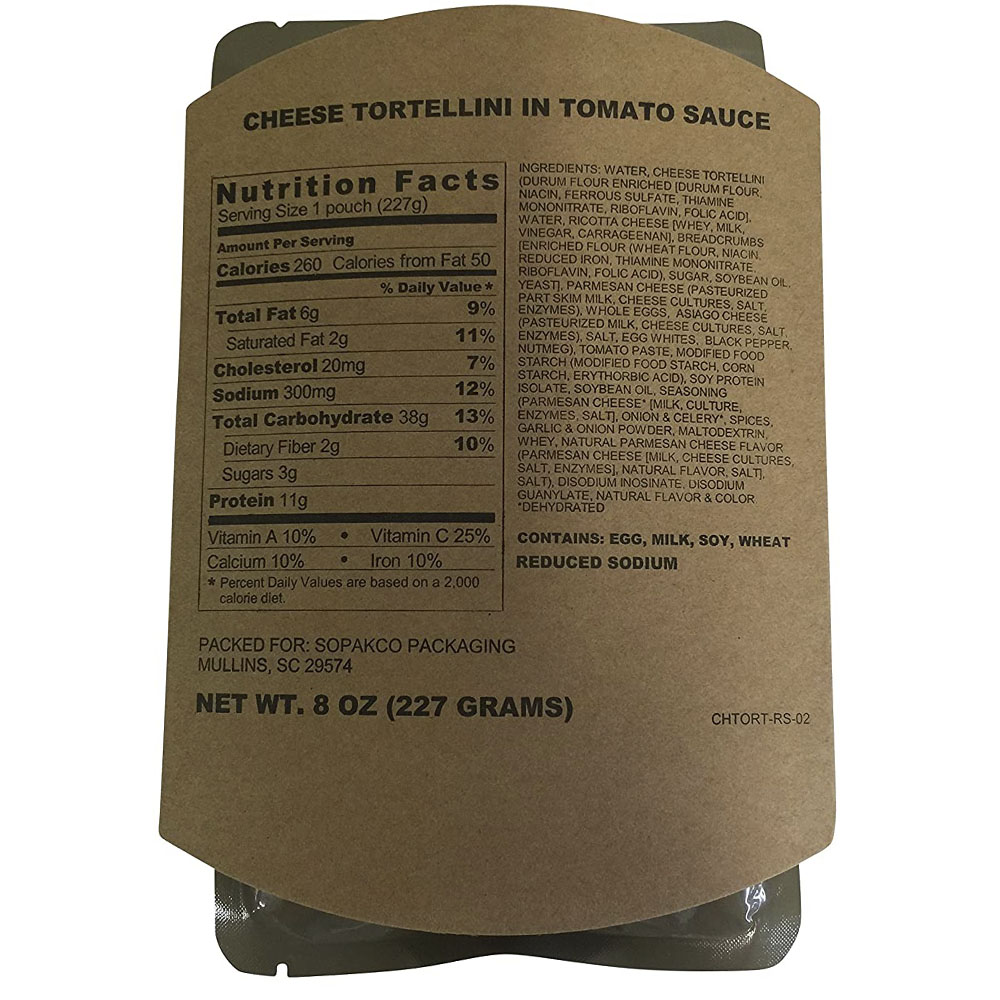 MRE entrees mean having very nutritious and emergency meals ready to eat anytime, ideal for outdoor recreational activities or military purposes. Enjoy the comfort of this combo blast, cheese filled tortellini floating in a very flavorful tangy tomato soup, perfect for those cool evenings or simply for any day if you are a pasta lover. The meal come fully pre-cooked and can be eaten either hot or cold carrying a very long life span. No refrigeration is needed at all.