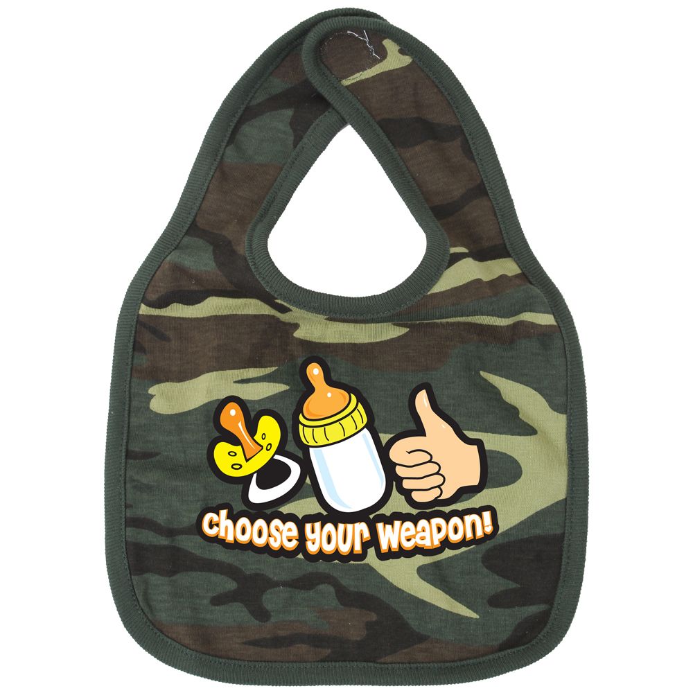 100% Cotton, Single Jersey, Woodland Camo Bib W/Choose Your Weapon Graphic On Front, Hook & Loop Closure.