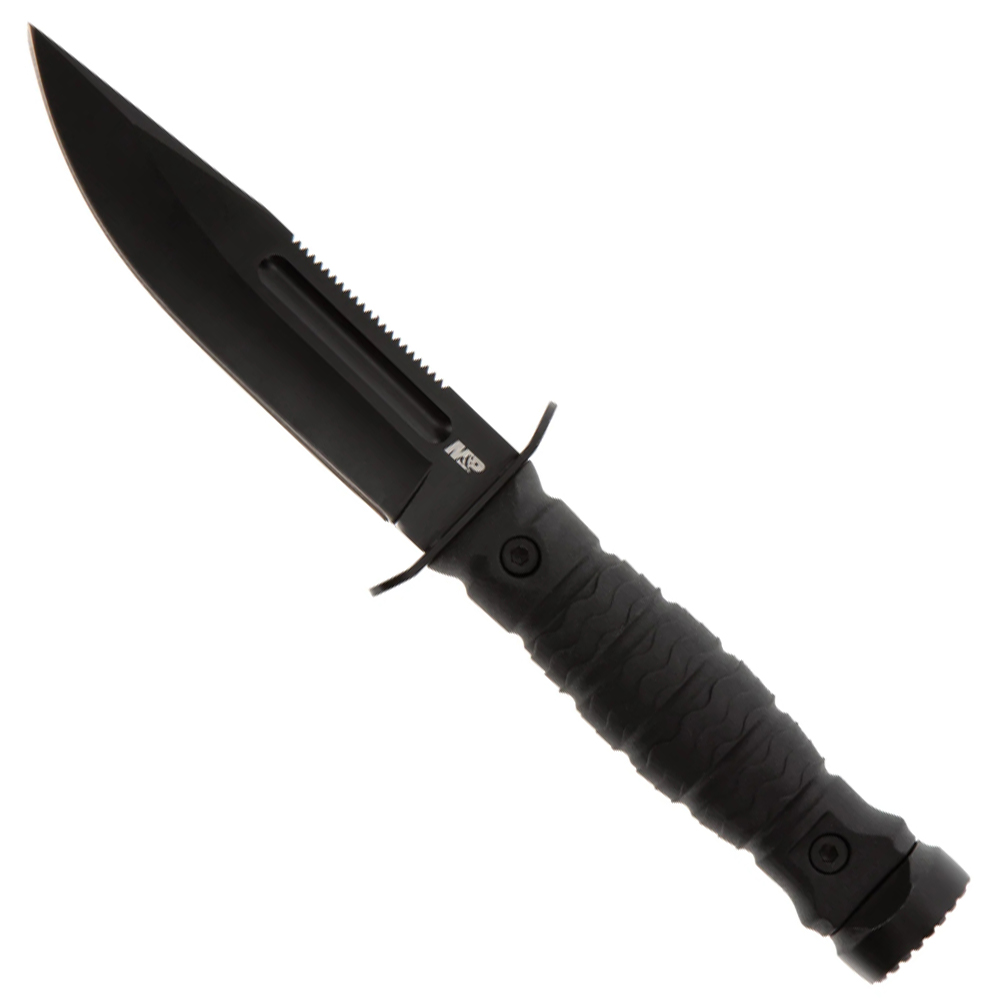 The Smith & Wesson M&P Ultimate Survival Knife is made up of a 5" black coated sawback blade that is perfect for any heavy cutting task, making it great for tactical or outdoor uses. The black polymer handle contoured for a comfortable grip and present is a lanyard hole for alternate carry. The knife also comes out-fitted with a black synthetic belt sheath for easy transportation.