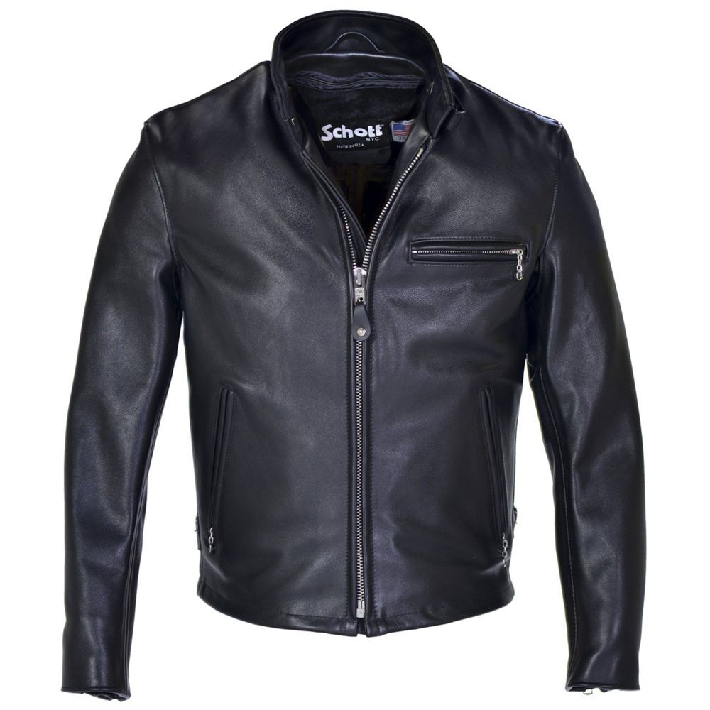 The Schott NYC model 141 is a true classic racer leather motorcycle jacket made from the finest naked cowhides. With its stand-up collar and its bi-swing back, it always makes for a clean, perfect fit.
