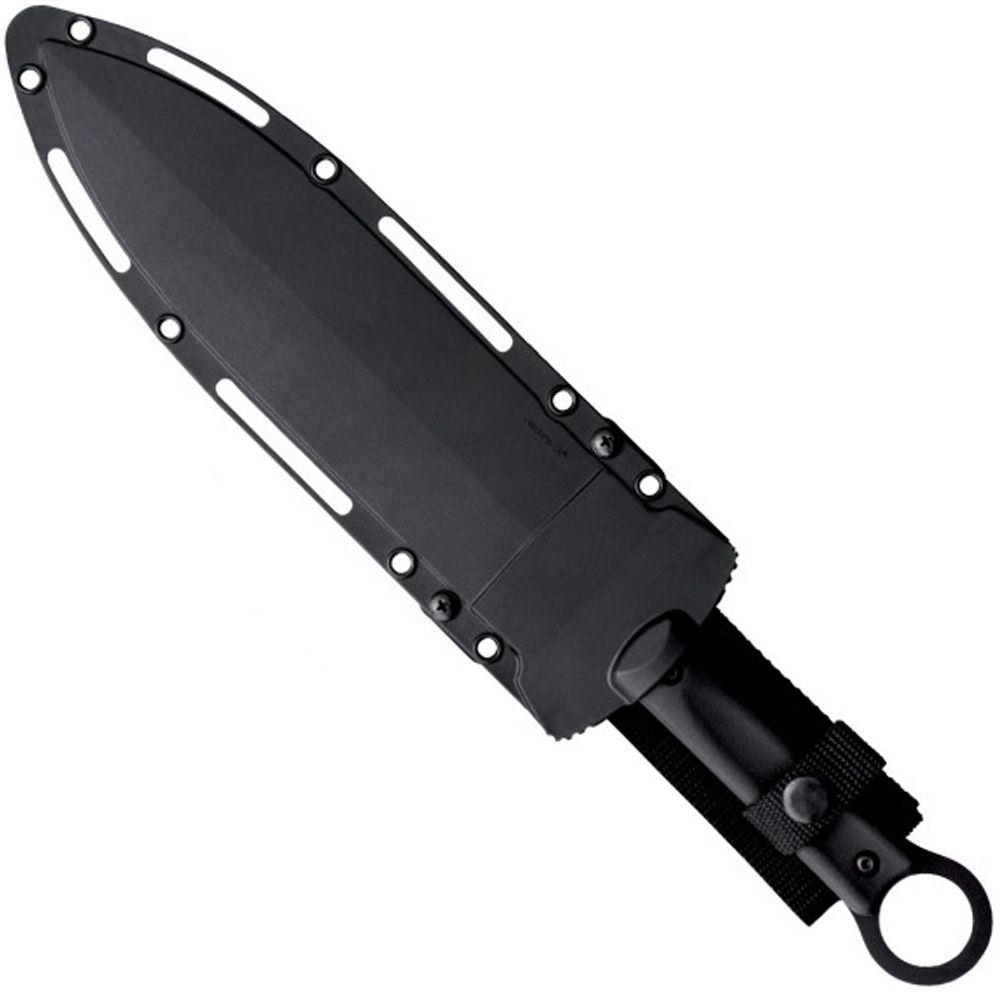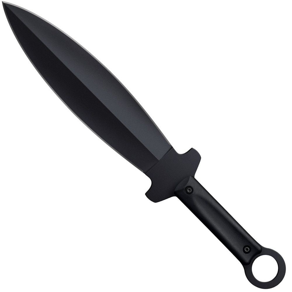 The signature ring on our Shanghai Shadow allows tremendous versatility when handling this popular and fun knife. It provides a totally secure grip when the index finger is locked in place through the hole. The wielder can also pivot the blade around the index finger for a quick change of grip, and even use the ring as a means of extending his or her reach by as much as four inches. Made from one solid piece of 1055 Carbon steel the Shanghai Shadow has a tough spring temper and twin hollow-ground edges. It is provided fully sharpened, and equipped with a heavy-duty military style Secure-Ex sheath.