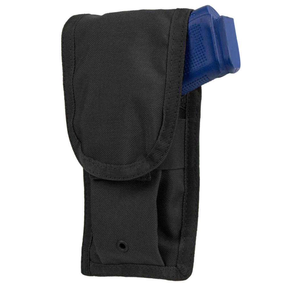 The hook and loop flap closure ensures your firearm is safely secured yet easily reachable when you need it most. With dimensions of 8.5"H x 4"W x 1.5"D, this pouch is designed to offer durable protection while maintaining a streamlined profile that doesn’t add unnecessary bulk to your gear.