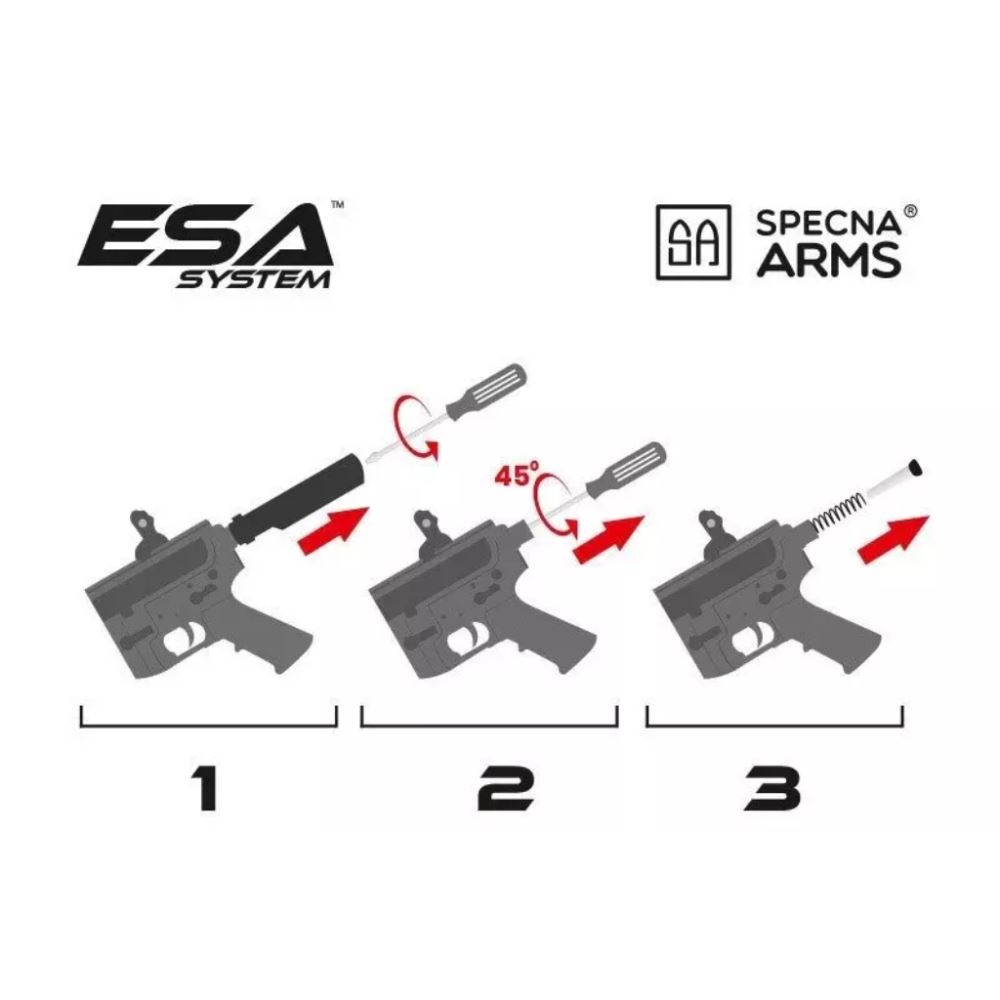 The Specna Arm Core series (licensed by Rock Rivers Arm) introduces to the market affordable AEGS without any compromise on quality and performance. This new series is fully compatible with LIPO and LIFE battery. The weapon’s gearbox comes with upgrades like 8mm ball bearings, steels gears and is secured with 4 anti-reversal latches. For more precision and accuracy, a rotary Hop-Up with a 6.03 mm diameter tight bore barrel is also integrated which enable repeated shots at a stable variation of BBs. With those reinforced internals, the replica come out of the box ready to be use with a M140 spring. With an ESA™ Quick Spring Change System, you can adapt your replica’s power to your preferences or condition on your gaming sites. Quickly change your main spring. You must only remove the gearbox from the receiver to have access to it without the need to disassemble your gun or going to any workshop.