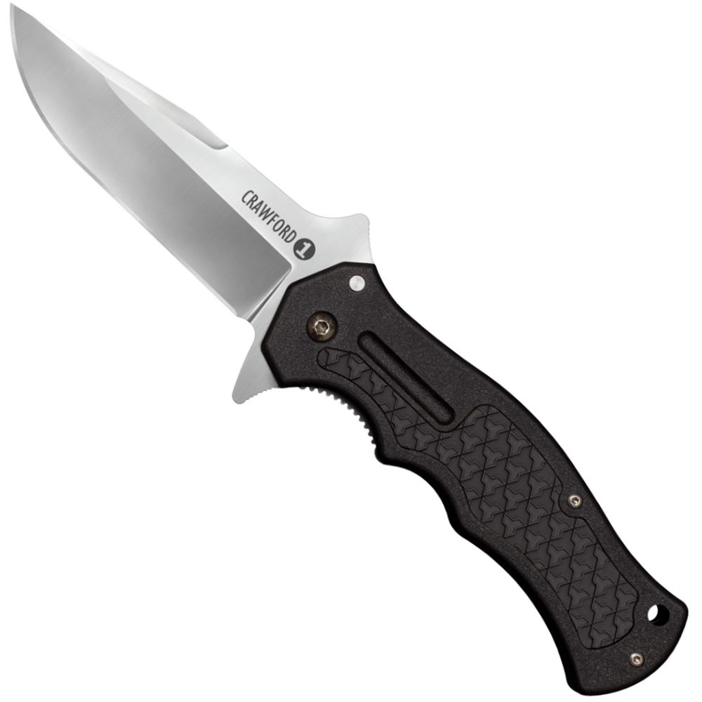 Wes Crawford, the custom knifemaker, has been a friend of Cold Steel for years, so they were happy to collaborate with him on the creation of an inexpensive version of one of his pricey custom flippers. The result was the Crawford Model 1. Strongly resembling Wes’ custom knife, the blade features a wide saber grind and a strong, sharp point with plenty of belly for cutting and slashing. It's made from Japanese 4034 Stainless and is hollow ground to a thin, razor edge that will cut at the slightest touch. And, because Wes' flipper is integrated into the tang, it can be opened lightning fast! The handle of the Crawford Model 1 mimics Wes' original's profile and silhouette but is made from a strong (yet economical), glass-reinforced nylon that includes black traction rubber inlays and a low-profile pocket clip. To keep your fingers safe from potential harm, Cold Steel has equipped the Crawford 1 with a leaf spring lock, and a (patent pending) secondary safety mechanism that is extremely resistant to shock and impact.