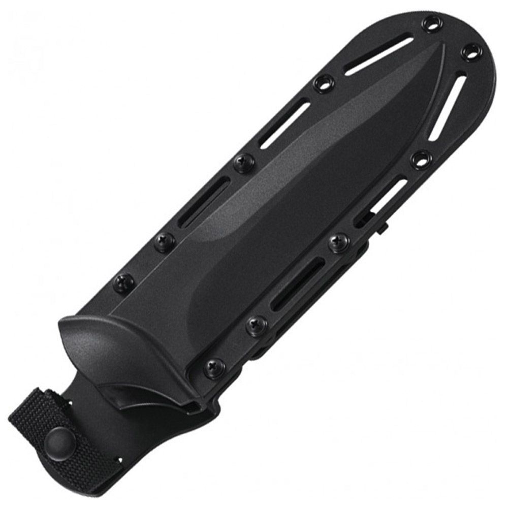 Custom Knifemaker Jim Hammond designed, with Arcenio James Advincula's concepts, a knife series with "no bull" attitude. Having the right tool for the job, and the bonus of a trainer to help hone your skills is mission critical.An "aggressive" drop-point blade shape features a razor-sharp, slight recurve bottom edge along with a sharpened leading top edge. Combine those with the false edge upper, hollow ground profile, very robust 0.24-inch thick full-tang—and it is lights out toughness.The handle is purposefully shaped of black G10, complete with pronounced finger grooves and full blade guard. Grip position is slightly angled in relation to the blade for maximum energy transfer when in use.And for the ultimate in versatile field carry, the sheath goes well beyond the extra mile to ensure you limitless carry options without having to make your own mods. Molded black nylon with glass fiber reinforcement halves are assembled to create a form fit "click in" cavity to contain the knife. A snap strap further secures the knife safely, even inverted. The sheath has been designed to accommodate Molle clip attachments, as well as having a leg strap and ample slots/grommets for lashing if warranted. It comes complete with all of the required hardware for belt or Molle attachment in either high or low positions.