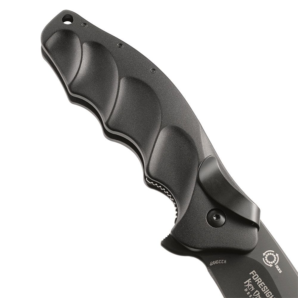 This folding urban tactical knife proves that form follows function with swept finger grooves, a formidable AUS 8 blade, and the smooth and fast IKBS™ opening system. Whatever the need, you’re good to go through anything with this bad boy of a blade. Ken Onion of Kaneohe, HI designed the CRKT® Foresight™. As a veteran, an experienced custom knifemaker, and the youngest member to ever be inducted into the Blade Magazine Hall of Fame in 2008; he’s the real deal when it comes to knives. This one is just another example of Ken’s tight mechanics and comfortable form in a blade that’s ready for your urban law enforcement and professional tactical needs. The 3.5-inch modified drop-point blade has a generous belly and re-curve cutting edge. Precision ground AUS 8 stainless steel and coated with a Black Titanium Nitride finish, it absolutely rips through anything that comes its way. Yet it opens like a well-oiled cutting machine. The IKBS™ ball bearing pivot system coupled with an InterFrame build style provides fast opening action for the blade with great rigidity. Just push down on the opening flipper with your finger and the blade is called to attention. Then a locking liner engages the blade tang for a solid lock-up. You’ll be safe. If only the same could be said for anything standing in this high-quality folding knife’s way.What truly sets this blade apart though is how it feels when you hold it. The cold-forged aluminum handle of the Foresight™ is purposefully styled and shaped with swept finger grooves and proper palm swell to provide a confident, comfortable grip no matter what the use. You’d swear the designer made a mold out of your own bare hand.Even the way the knife gets transported was well thought out. A blackened, stainless steel carry-clip is designed and mounted to provide a “low-profile” carry that is deeper in the pocket.