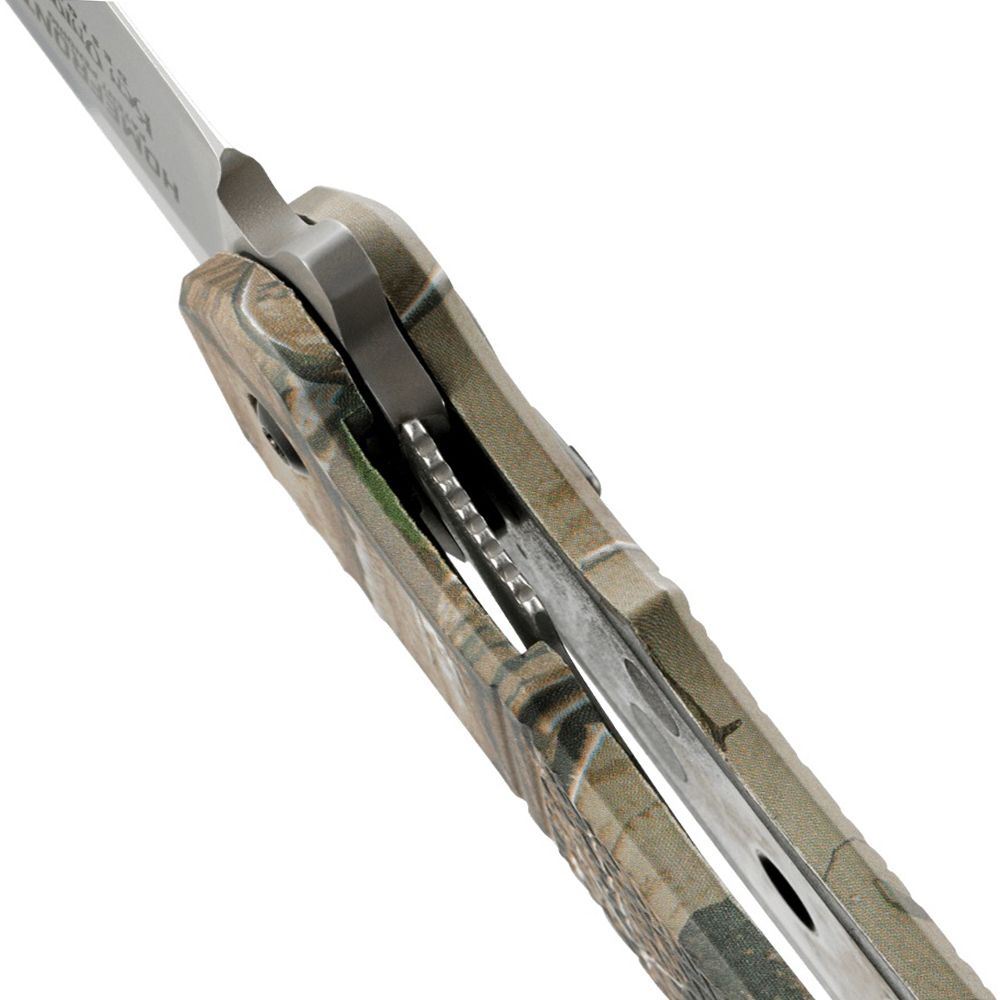 From his shop in Kaneohe, HI, Ken Onion designed the Homefront™ Hunter to reflect both vintage WWII military styling and complex, effective hunting camouflage. The lug-style flipper sets off the smooth open action of the stainless steel blade, while tank jimping on the backstrap sits snugly against your palm. The big-bellied blade is ideal for long, sweeping swipes when you’re field dressing your kill.