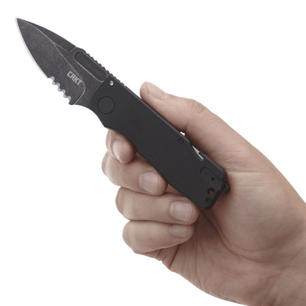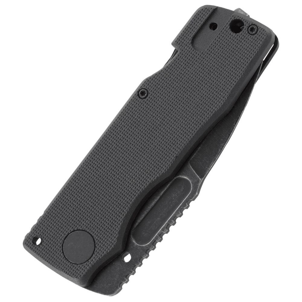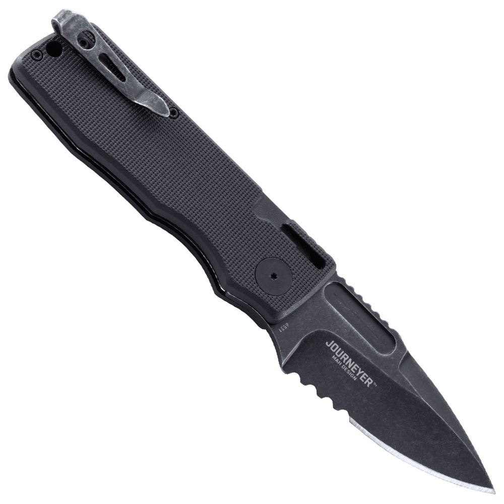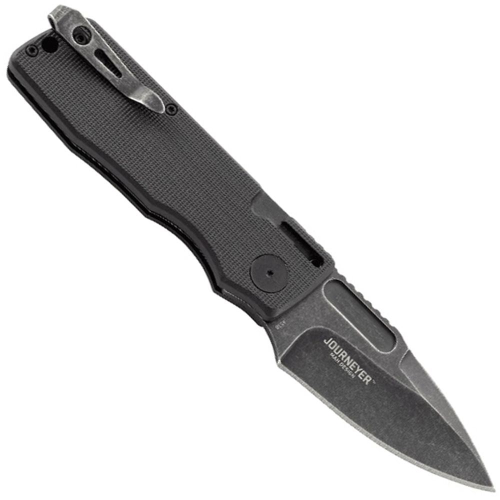 The Journeyer is slipjoint folder design from Liong Mah that can also be manipulated into a locked open fixed blade. The 2.76" blade is made from 8Cr12MoV stainless steel with a blackwash finish and hollow ground drop point shape. There are no thumbstuds so it may be considered a two-hand opener but there is a groove you can use to open the blade with your thumb. There is a small torx wrench tucked into the handle which can be used to adjust the knife and slipped into a slot in the handle to prevent the blade from closing. It's an ingenious way to take a knife that is legal almost everywhere and turn it into a hard user. The handle is 3.86", made from glass reinforced nylon and it comes with a very nice deep carry pocket clip. If you frequent localities with strict blade laws, consider the Journeyer for your everyday carry choice. Available with or without Veff flat top serrations.Turn Liong Mah's new folding everyday carry knife into a virtual fixed knife simply by pulling out the pin tool in the back of the handle and placing it into the blade slot. The black stonewashed blade will do the rest for the years of journeys to come.Designed by Liong Mah, of Palm Bay, Florida, the Journeyer was born out of necessity. Knife laws in many areas of the country strictly govern blade size and locking mechanisms, leading Mah to the realization that there was a need for a classic slip joint folding knife that is safe and functional for performing daily tasks.To lock the Journeyer blade in place, simply pull the T6 torque wrench pin tool from the back of the handle and place it into the blade slot. You can also use it to adjust the pivot tension. The 2.75" stonewashed blade is then ready to get to work on the hardest utility tasks—not to mention have your back when it comes to safety. And the glass reinforced nylon handle provides unmatched grip on a knife that you can feel comfortable carrying anywhere.If you're looking for a knife to accompany you on trips for years to come, travel with the Journeyer. In the folded or the locked position, it goes the distance.