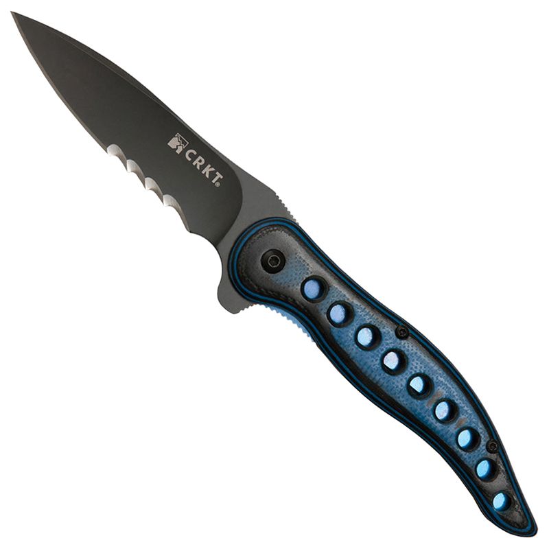 How does Gerry McGinnis keep his grades up as a student at North Carolina State University and still keep coming up with new and interesting knife designs? We don't know, but we just couldn't resist putting his new Premonition line into production. Premonition 1163K. This every day carry (E.D.C.) features a precisely angled flipper for extra-fast one-hand blade opening. Because of the flipper, the knife does not need either thumb studs or nail nicks for opening. The frame is a lightweight open build of hand-contoured, layered blue/black G10, with a stainless steel strip lock inlaid into a machined relief in one handle frame. The frame is curvilinear to fit the hand, and is amply skeletonized with nine lightening holes on the other frame. The black Zytel back spacer is forward on the handles, allowing maximum blade length for this length of handle. The 3-1/4-Inch drop point blade is premium 8Cr14MoV stainless steel with a high hollow grind. It features a black oxide coating.