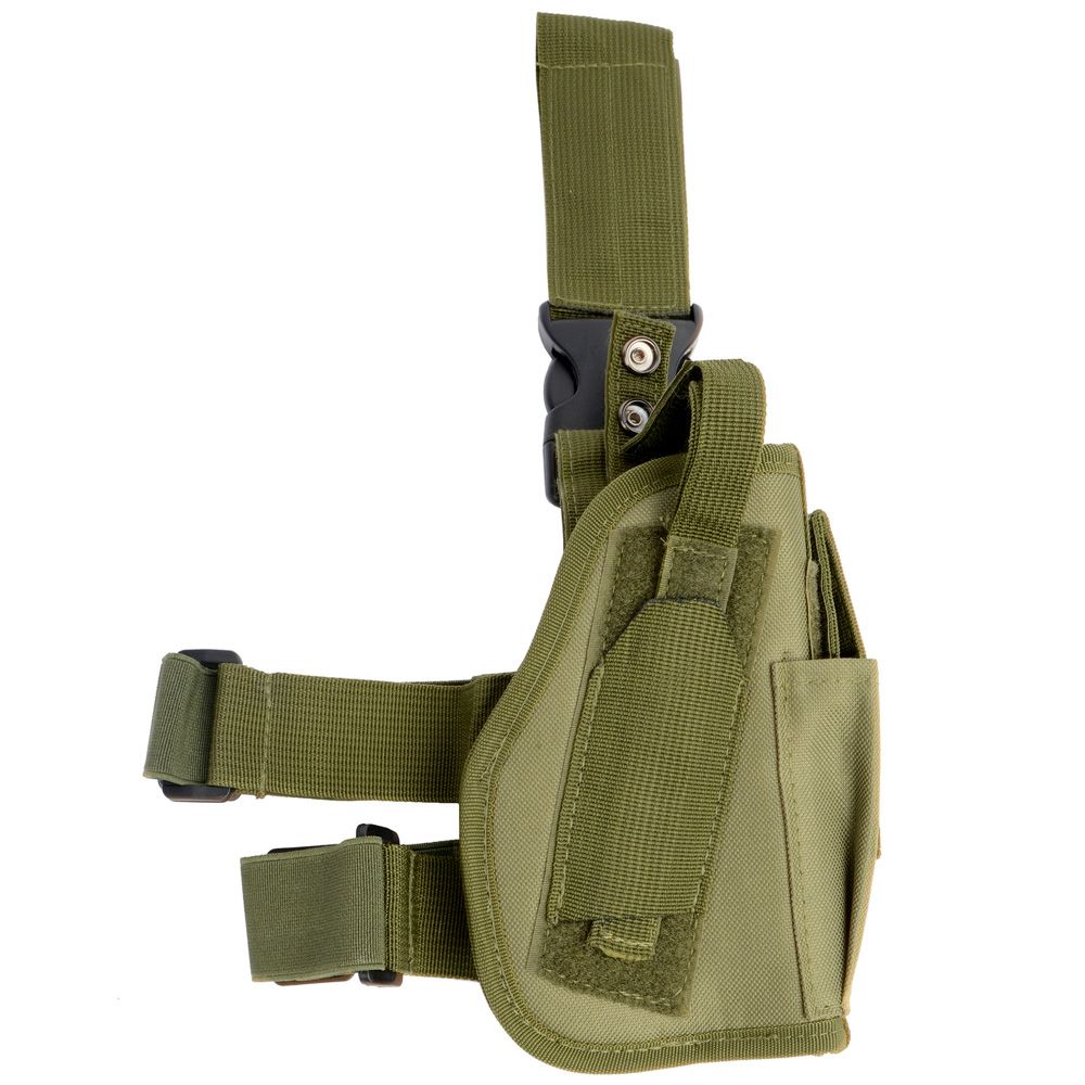 Sleek and tactical, the Cybergun Cybergun Adjustable Drop Leg Holster will add an edge to your field uniform. This lightweight holster is designed to make your weapon accessible at a moment's notice and can be adjusted to fit each individual user. A built-in mag pouch and quick release buckles are also included.