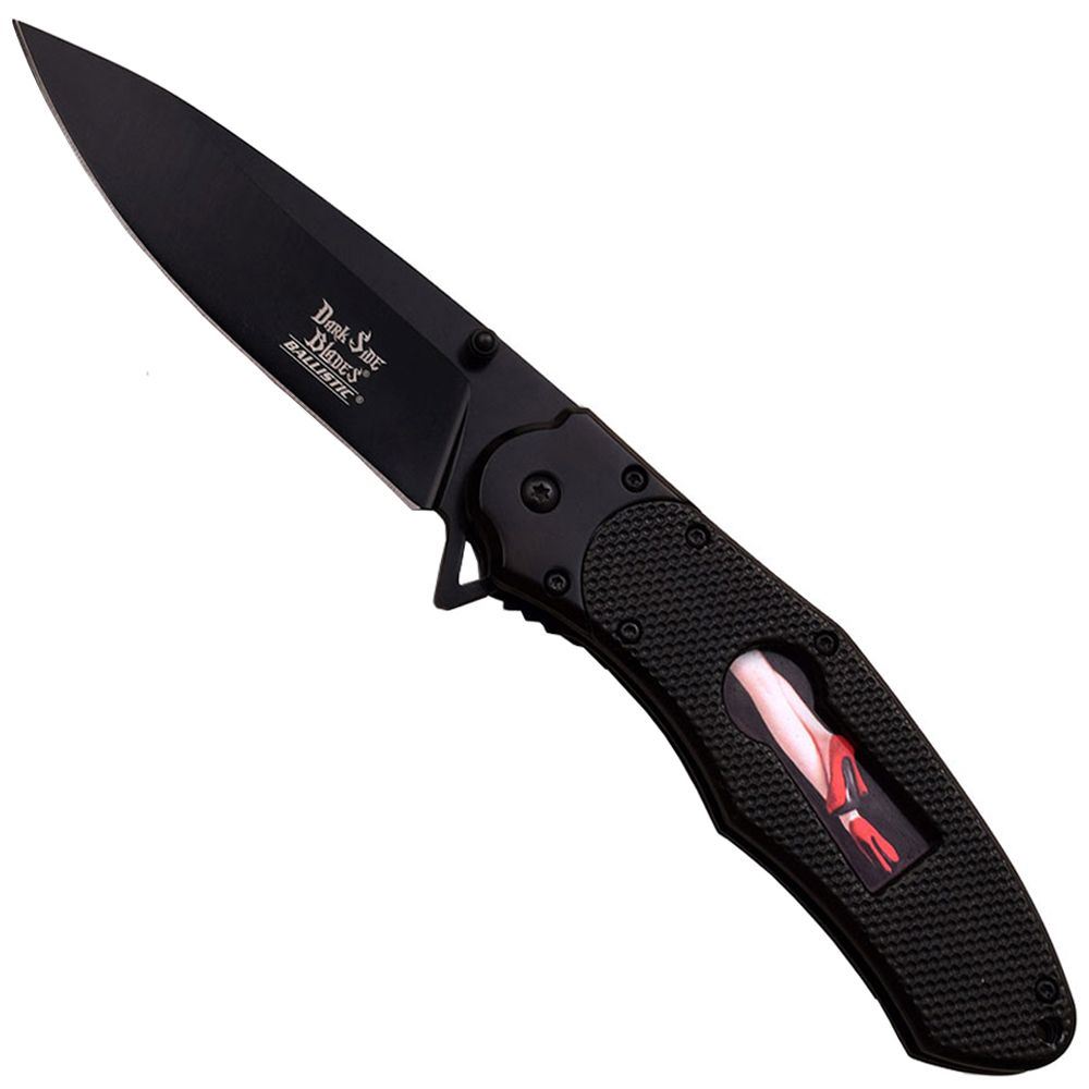 3.75" 3mm Thick Plain Edge, Black Finsh Drop-Point, Stainless Steel Black Coated Blade4.75" Closed, Black Stainless Steel BolsterBlack Anodized Aluminum, Full Color Thermal Transfer ArtIncludes Gold Ti-Coated Pocket Clip.
