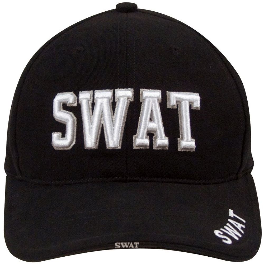 Raised Embroidery Swat Lettering Is White Sandwich Brim With 1 Pc. Woven Label Closure With 1 Pc. Woven Label Front Panel With Swat Raised Embroidery On Front Corner Upper Brim With Swat Direct Embroidery Seam Tape With One Color Direct Print Rothco.