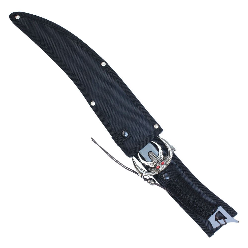 In your home, you display the weapons once wielded by your fallen enemies. Among your collection of swords rests the Double Crescent Demon Sword. Made from stainless steel, this sword has a curved, double-edged blade. There are two cutouts on one side and then the blade has a straight ricasso. The sword continues with the handguard. This handguard looks like a demon's face with two crescent shapes behind it. Then, the sword continues with a curved handle. The handle has a black paracord-wrapped grip. In addition, it has an arrow-shaped end cap. The cap has a triangular cutout. Attached to the end cap is a tassel with a single skull bead at the end. Finally, the sword comes with a black nylon sheath. This fantasy sword makes a wonderful addition to any decor. Display it in your home or office.