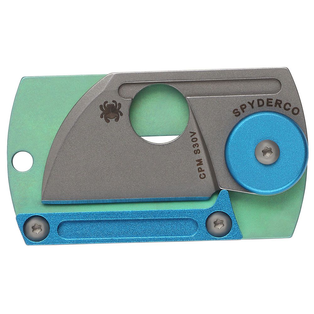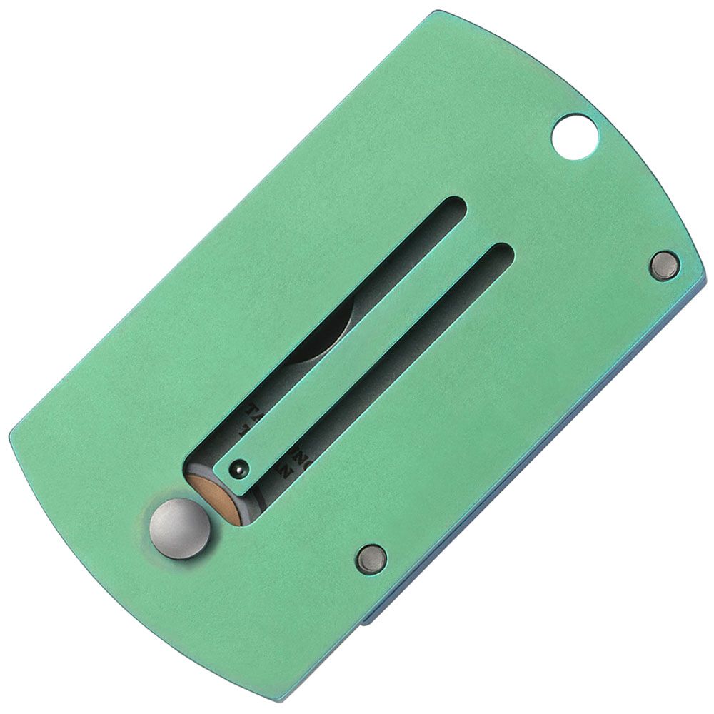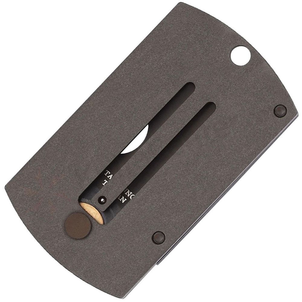 Based on one of Serge Panchenko’s most popular custom designs, the Dog Tag Folder is a unique departure from Spyderco’s typical folding knife construction methods. Its single-sided handle is fabricated from solid titanium and accurately replicates the size and shape of a military dog tag. The center of the handle scale is machined to create an integral spring bar that houses a steel ball bearing for the blade’s detent mechanism. At the top of the handle is an aluminum back strap that defines the blade’s limits of travel in both the open and closed positions and provides protection from the edge when the knife is closed.