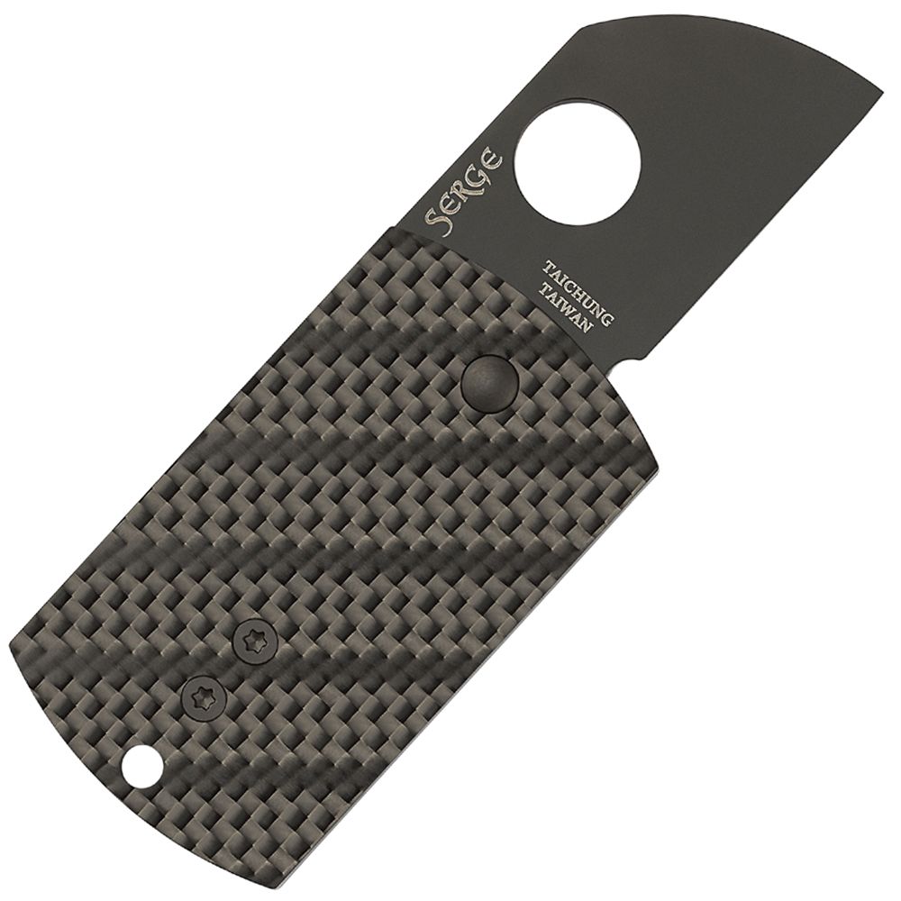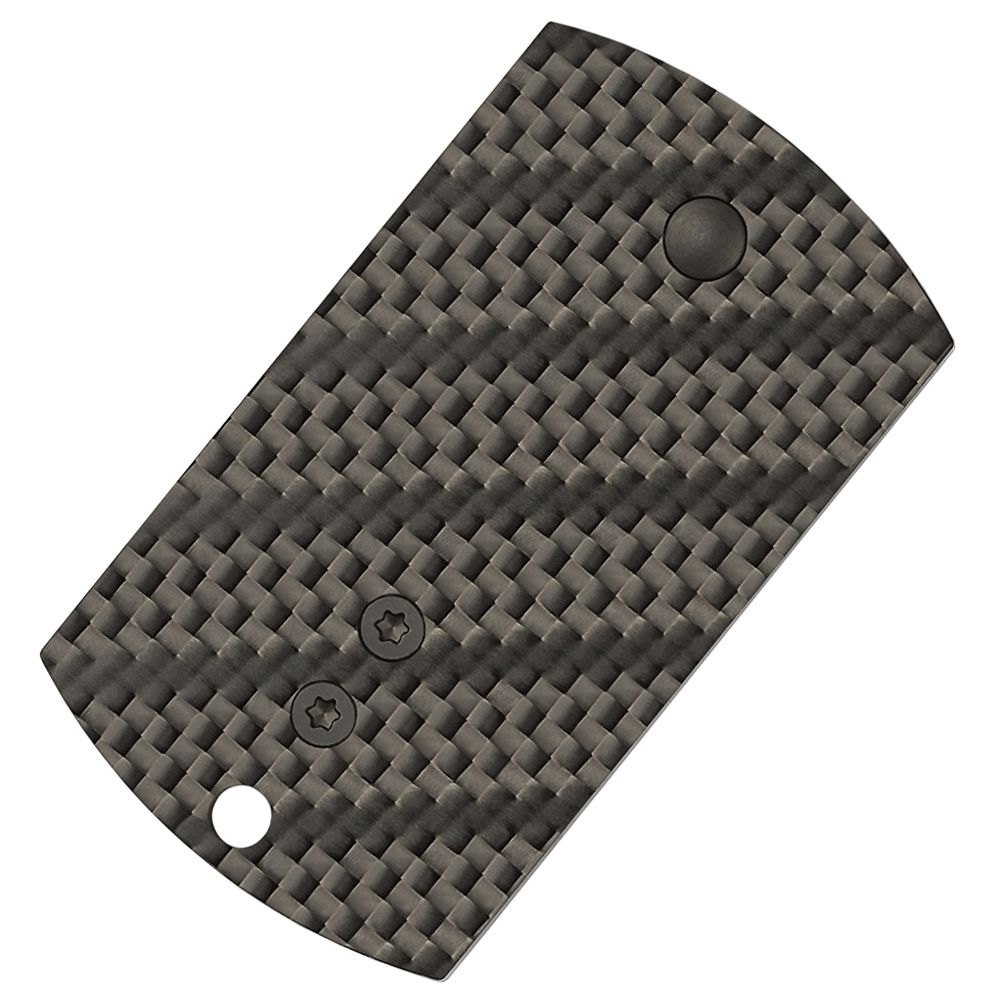 This version of the Dog Tag features a handle machined from a solid piece of black carbon fiber/G-10 laminate with an inlaid detent spring arm. The blade and all metal hardware have a matching black titanium carbonitride coating.