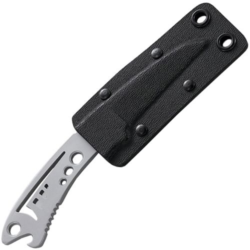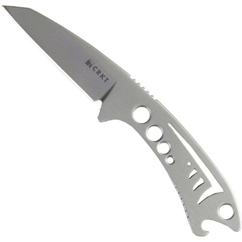 Tom Krein is a young custom knifemaker who has created quite a stir with his Mid Tech Dogfish neck knife. It seemed like the perfect affordable CRKT production knife so here it is. Tom has a great sense of style so unlike many skeletonized flat blades the Dogfish™ is graceful gives a secure grip and also has that dogfish face at the pommel which turns out to be—a lanyard hole and bottle opener! It has a secure finger choil and friction grooves at the thumb spine and near the butt.