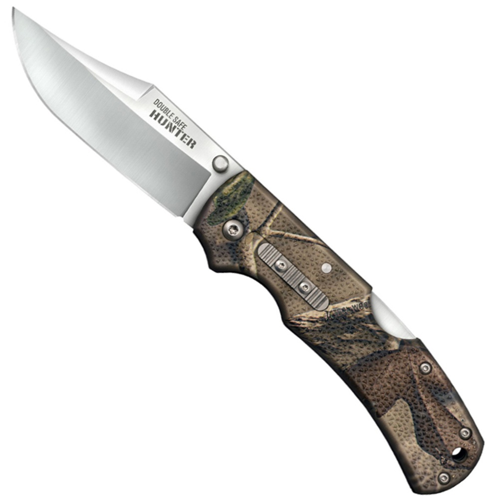 If you’re looking for a budget friendly yet high-performing folding hunter, look no further than the Double Safe Hunter. It’s modeled after our extremely popular old-school Voyager®. Its wide, clip-point blade is 3.5” in length and is comprised of 8Cr13MoV steel, tempered to 57-58 Rockwell hardness. No matter what job, you can be confident you have the right knife on hand, with a blade small enough for intricate cutting tasks, yet big enough to skin anything from a mouse to a moose. A dream to use for any length of time its camouflage glass-filled nylon (GFN) handle is thin and ergonomically pleasing and features a replaceable plastic pocket clip. Plastic pocket clips help to limit the snags and scratches to upholstery and other surfaces that steel clips have been known to cause. As always, Cold Steel had your fingers in mind when designing Double Safe. Its state-of-the-art rocker lock features a secondary safety mechanism, that when engaged is enormously resistant to shock and impact.
