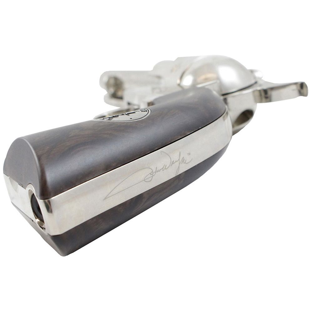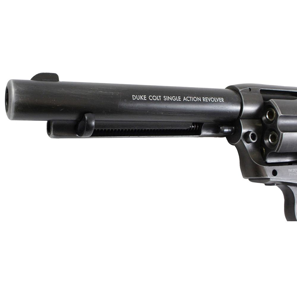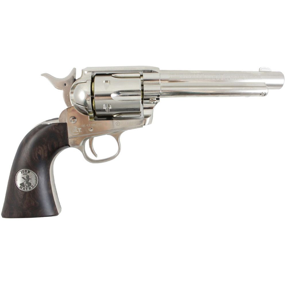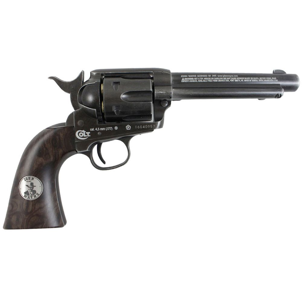Inspired by the man, the legend, the Duke—these John Wayne signature Colt Single Action BB Revolvers are made for a quick-draw and sharp shooting. Constructed with a full metal frame and available with a nickel silver or weathered gunmetal finish, the gun features fully licensed John Wayne and Colt engravings. Just like a real steel Colt .45 SAA, this pellet revolver has a functional cylinder, ejector rod, and loading gate that uses realistic rear-loading shells. This 4.5mm BB model has boosted firepower with a muzzle velocity of 410 FPS.