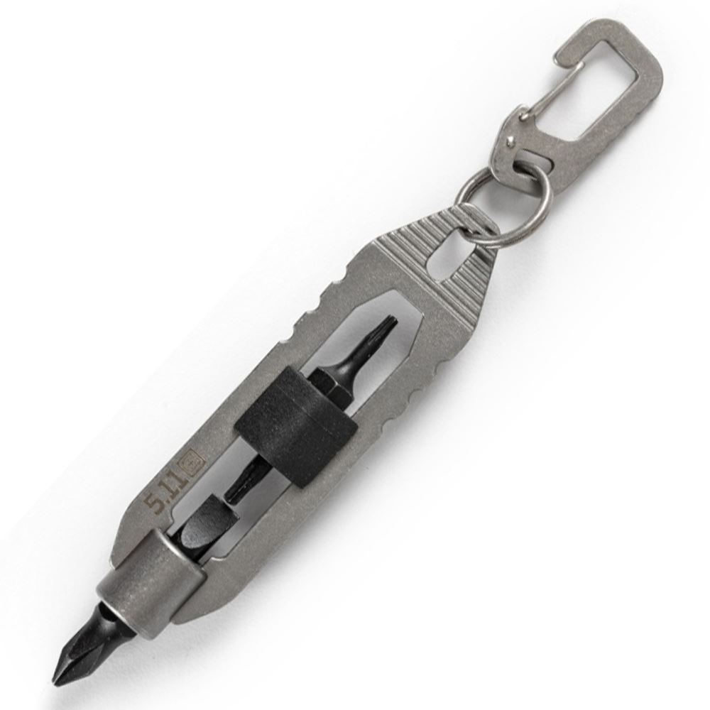 All gearheads face the same problems. Bolts and screws always work loose at the worst possible times and the right tools are never accessible. Respond with a 5.11 EDT Hex, which comes with four tip fastening options in a compact keychain carry form factor. Use the Phillips and slotted screwdriver tips for all those every day tasks, then deploy the T6 and T8 Torx heads, ideal for knife tune ups, optics, and electronic devices. The two headed bits are secured in place with ball detent feature, while the spare bit is stored in the center holder. Includes a split ring and micro Hardpoint carabiner for connection options. Imported.