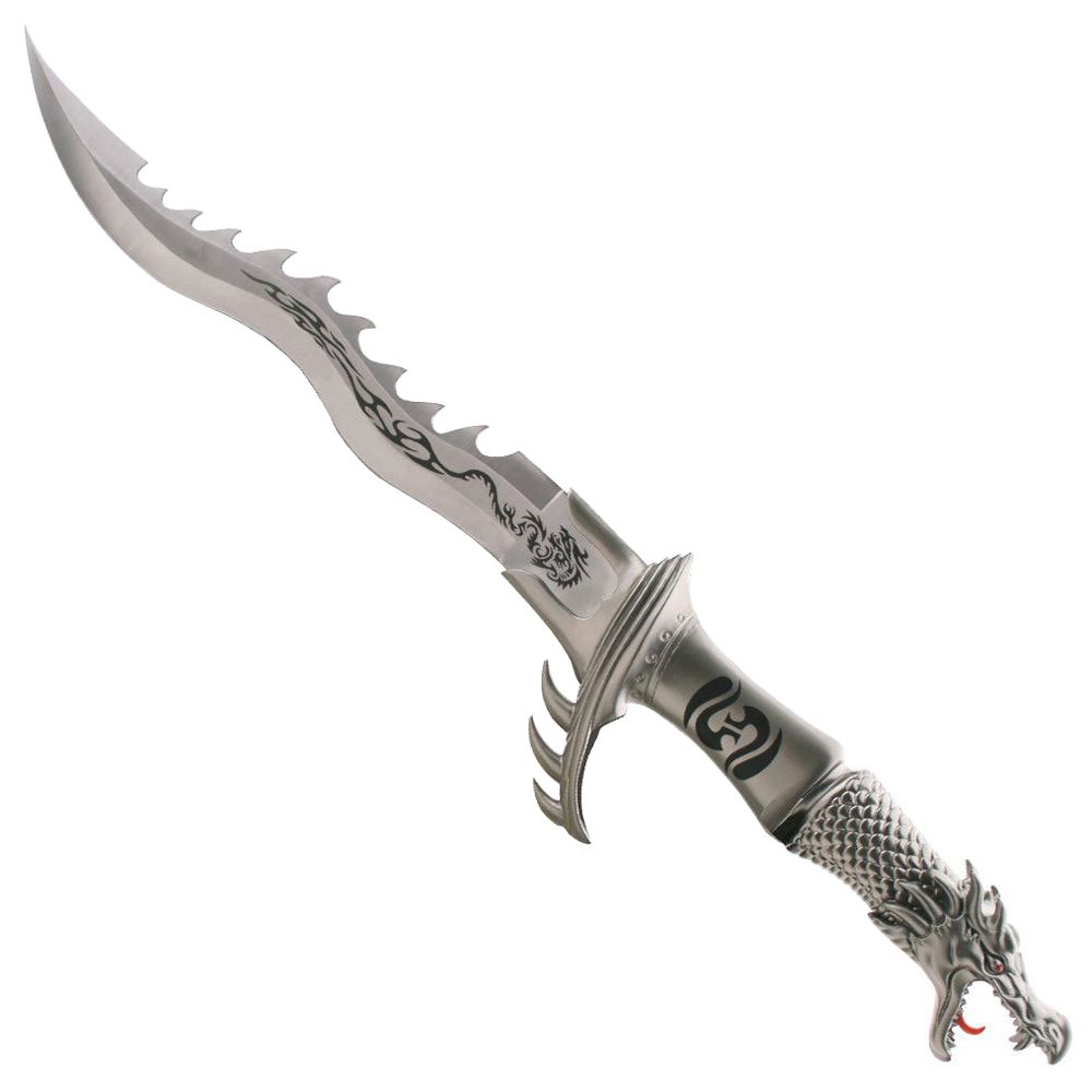 Fantasy Dragon Knife w/ Display24" OverallStainless SteelSatin with Dragon Etched on BladeCast Metal HandleIncludes Wood Display Stand.