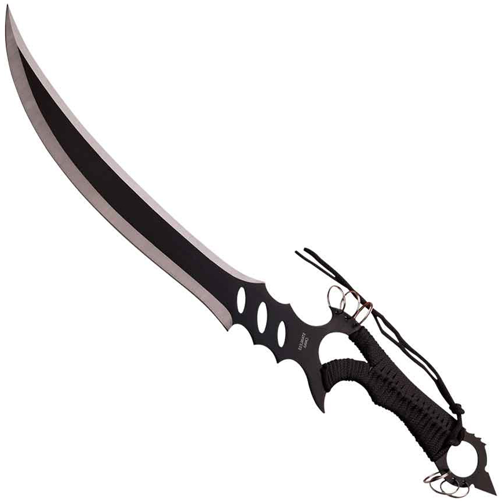 Do you want a sword with some serious fantasy style? If you do, you should make sure to check out the Ringed Hilt Two-Tone Fantasy Sword. Made from stainless steel, this short sword consists of a single piece of metal. It has a curved, double-edged blade. The edges are silver, while the body is black. At the base of the blade, there are concave curves along the sides of the ricasso. It also has three oval cutouts.