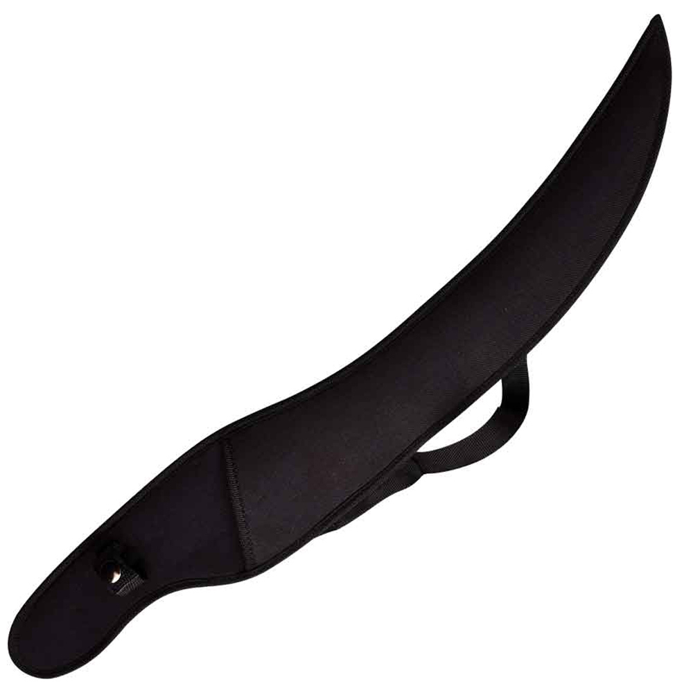 The decorative sword continues by curving upwards on the spine side of the sword. This curve forms a handguard. At the curve, there are three silver-colored rings that run through holes on the sword. The handle continues with a black cord-wrapped grip. The handle ends with an open circle and a point. The circle has three more rings on the edge side. Finally, this fantasy sword comes with a black nylon sheath. You can easily add this sword to any weaponry display or fantasy decor. The Ringed Hilt Two-Tone Fantasy Sword makes a true showpiece.