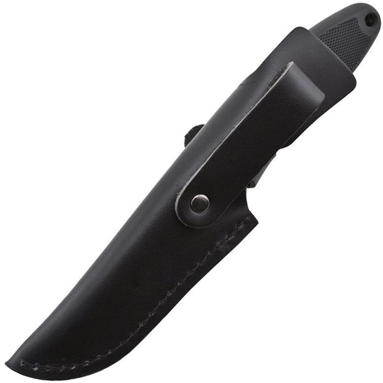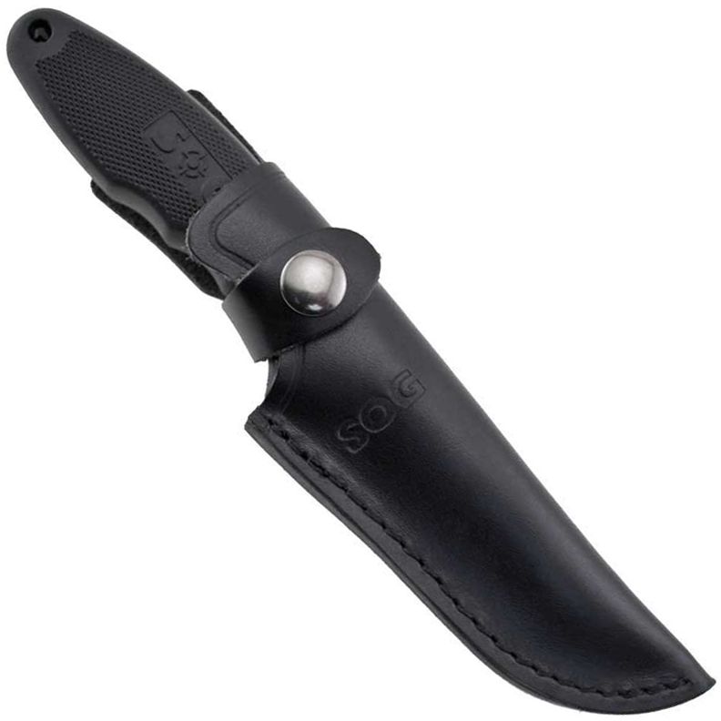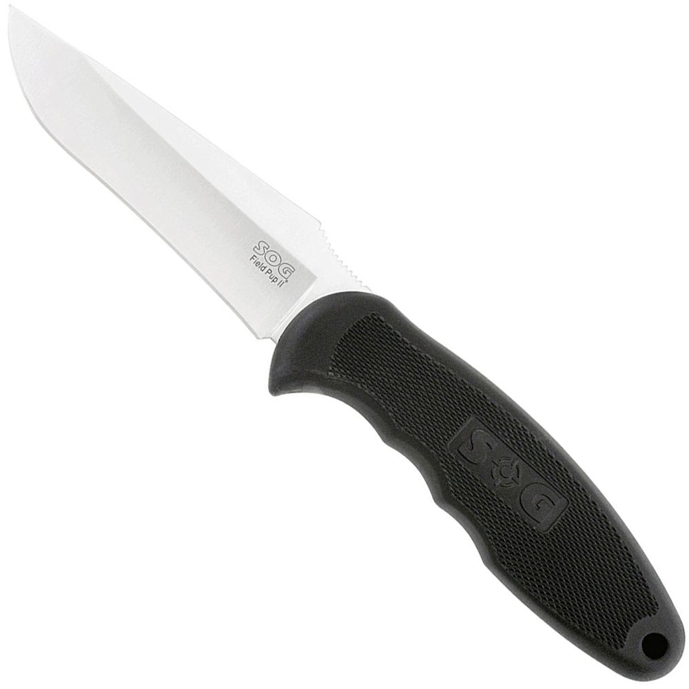 The Field Pup II is a beautiful knife with its high gloss Satin finish. It's the right size and weight, suitable for a variety of outdoor sporting tasks. It's comfortable to use with its slightly yielding Kraton molded handle that form fits the full tang blade. SOG's trademarked finger grips are combined with aggressive thumb notches on the back of the blade, making the Field Pup II a real working knife. The blade is also protected by a leather sheath.