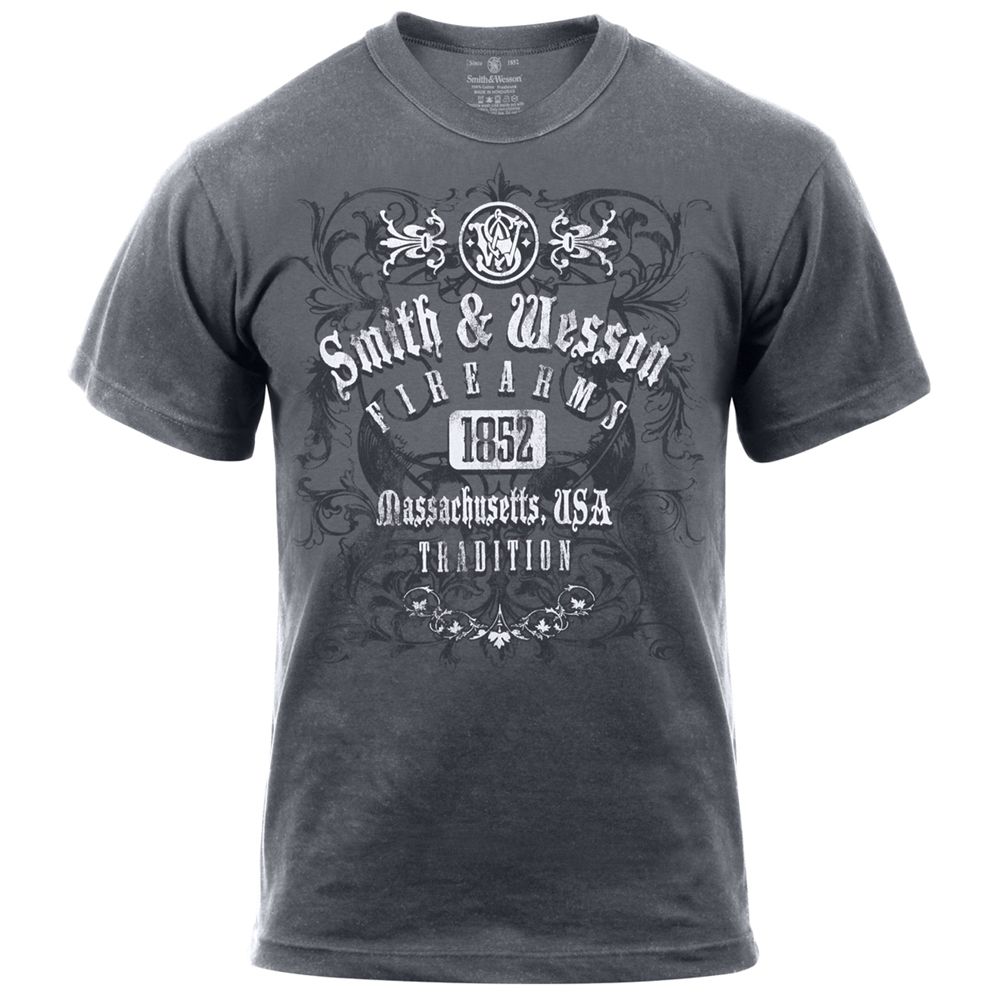 The officially licensed Firearms Tradition T-Shirt displays text that reads Firearms 1852: Massachusetts, USA, Tradition".