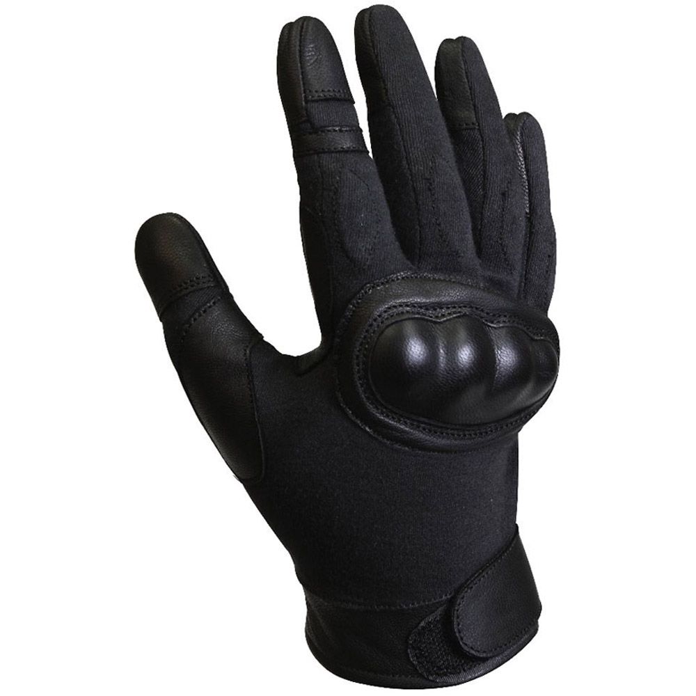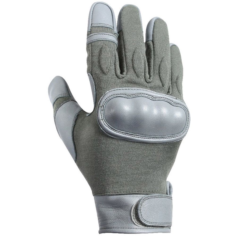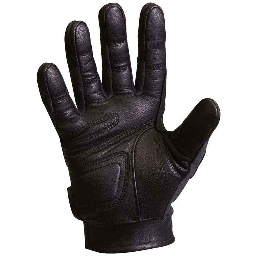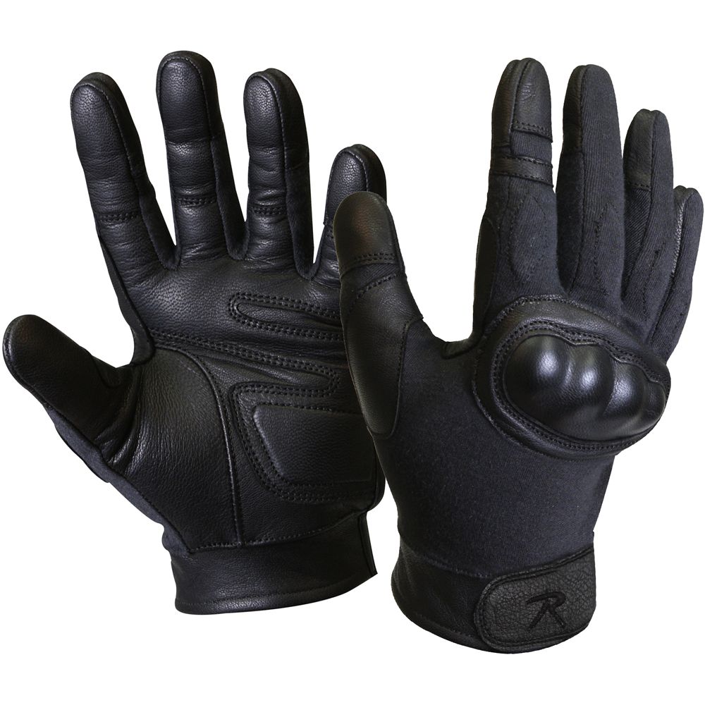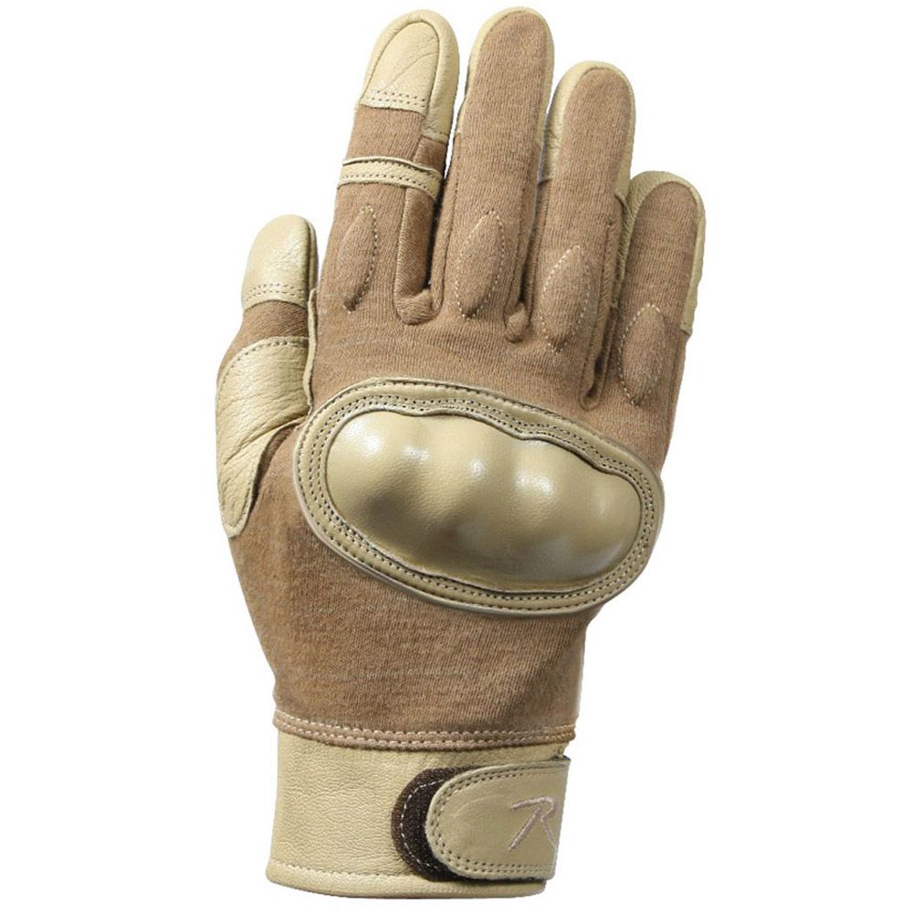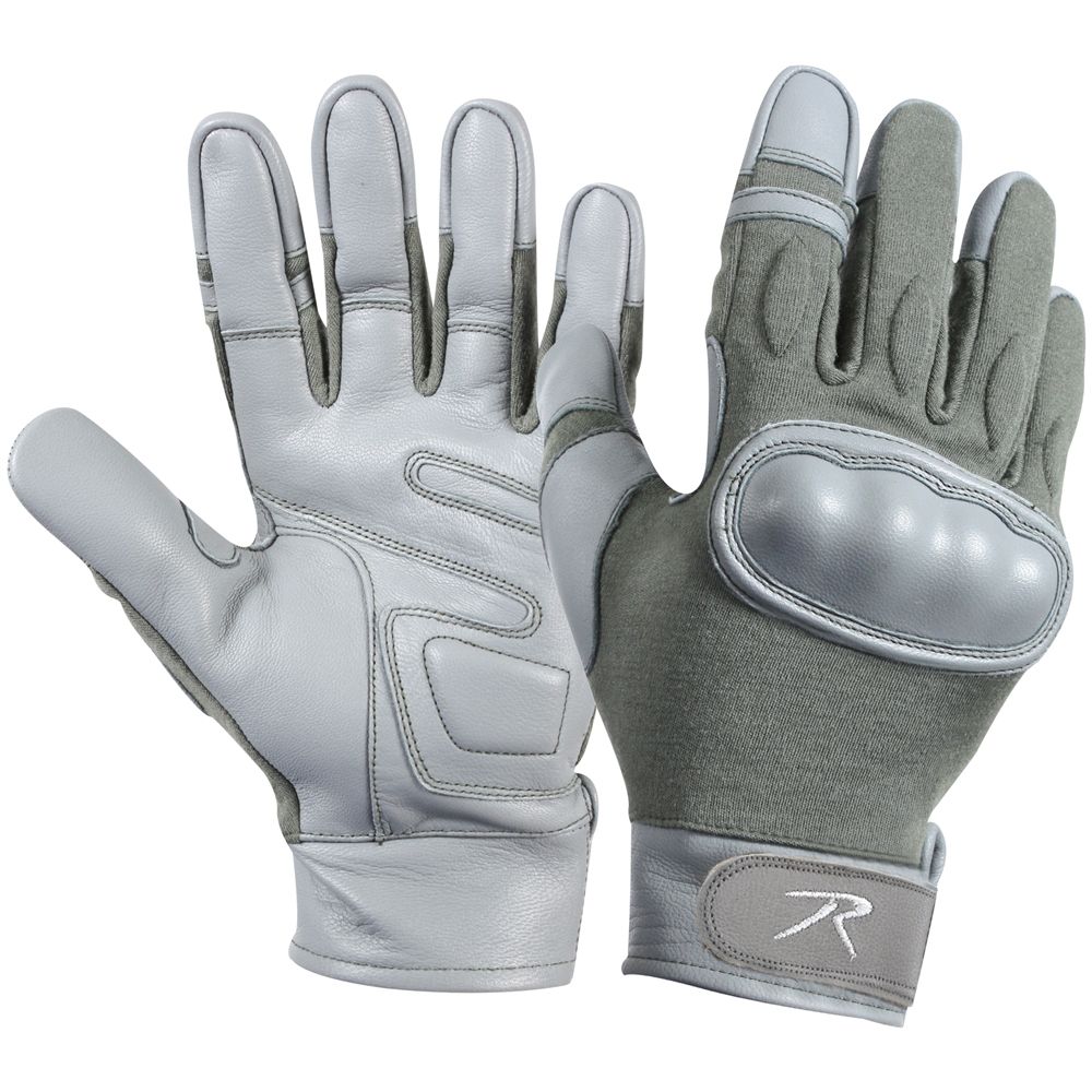 Rothco's Hard Knuckle Tactical Gloves have flame, heat and cut resistant material that provide protection on the entire back of hand and fingers as well as sides of the fingers. Molded knuckles with water repellent leather cover and water repellent leather palm, fingers and thumb. For a secure fit the gloves also feature a hook & loop closure at the wrist.