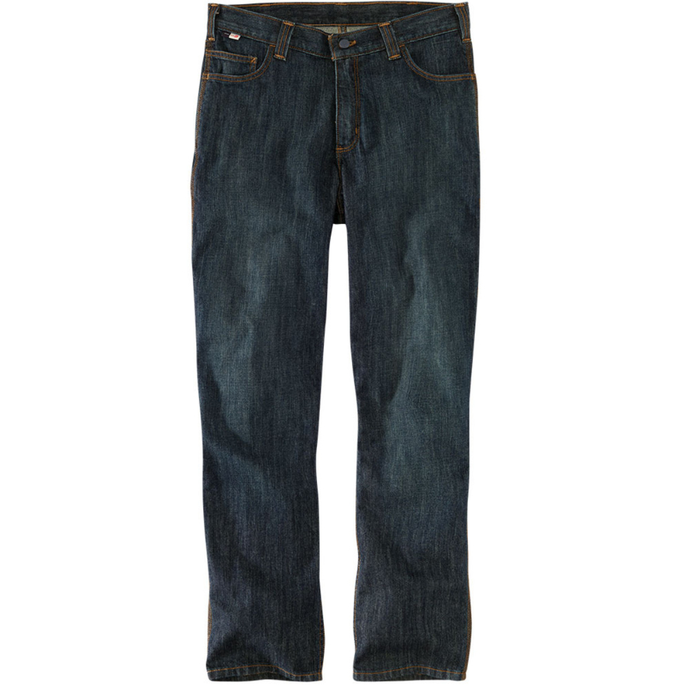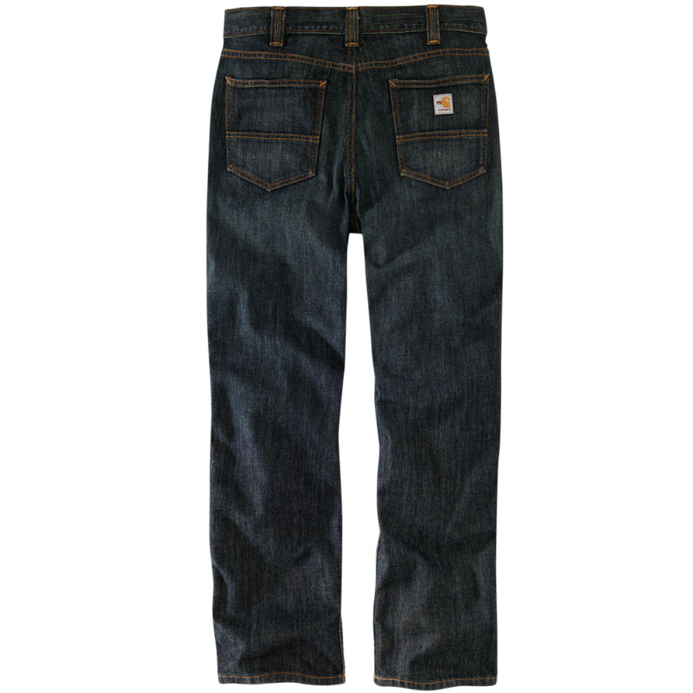 These men's Carhartt jeans are built to handle the toughest jobs. Flame-resistant denim wicks sweat and dries quickly. Cut for a relaxed fit with built-in flex for easy movement. ?11-ounce, 69% cotton / 29% modacrylic / 1% elastane / 1% aramid FR denim ?Meets the performance requirements of NFPA 70E ?UL® classified to NFPA 2112 ?Built to move with Rugged Flex® stretch technology ?Built with Force technology to wick sweat and dry fast ?FastDry® technology keeps you cool for all day comfort ?Relaxed fit: Comfortable fit through the seat and thigh with more room to move and a straight leg opening ?Strong sewn-on-seam belt loops ?Carhartt FR label sewn on back pocket ?NFPA 2112 / CAT 2 label sewn on waistband ?Imported FEATURES