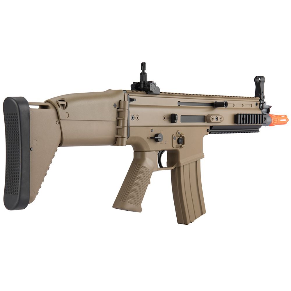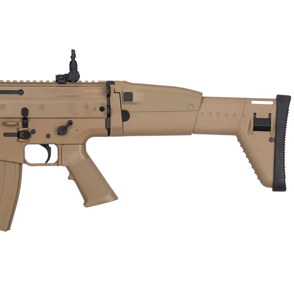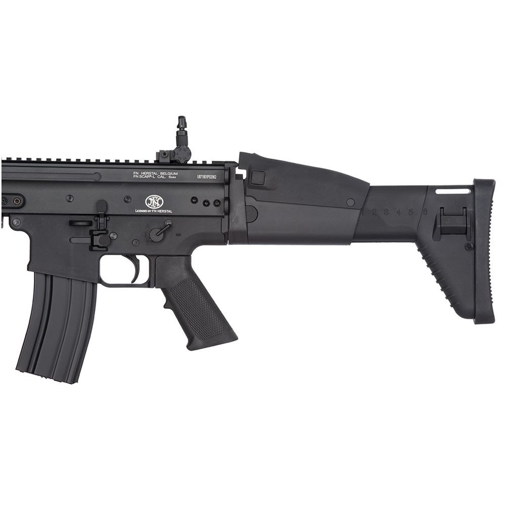 Adapt to any combat situation with the FN Herstal SCAR-L Airsoft Rifle. This full-sized field weapon is great for long-range combat and folds down to a compact SMG for CQB scenarios. Lightweight and easy to maneuver in the field, this replica offers power and realism. A full-length optics rail and quad-rail handguard allow you to customize your setup with a scope, laser, or other tactical accessory. The full-metal V2 gearbox is compatible with 9.6v NIMH batteries and can be upgraded to take LiPo batteries.