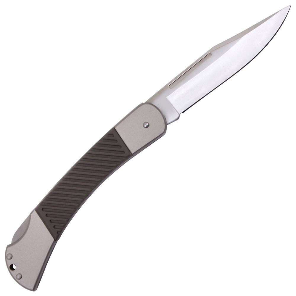 Folding Pocket Knife is a buck style folding knife measuring 8.5" in length. The stainless steel non serrated blade measures 3.5" with a 1/8" thickness. This pocket knife features a push button closure, a 2.5" grip, and a keyhole at the bottom.