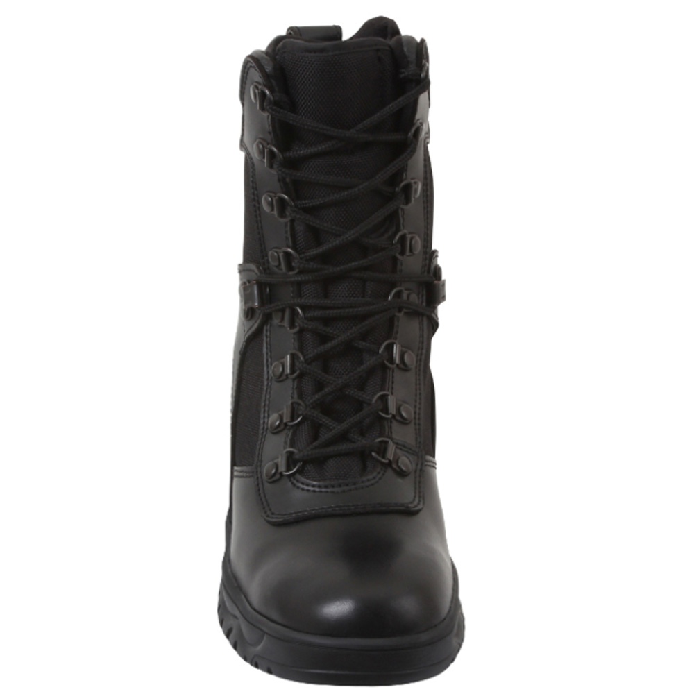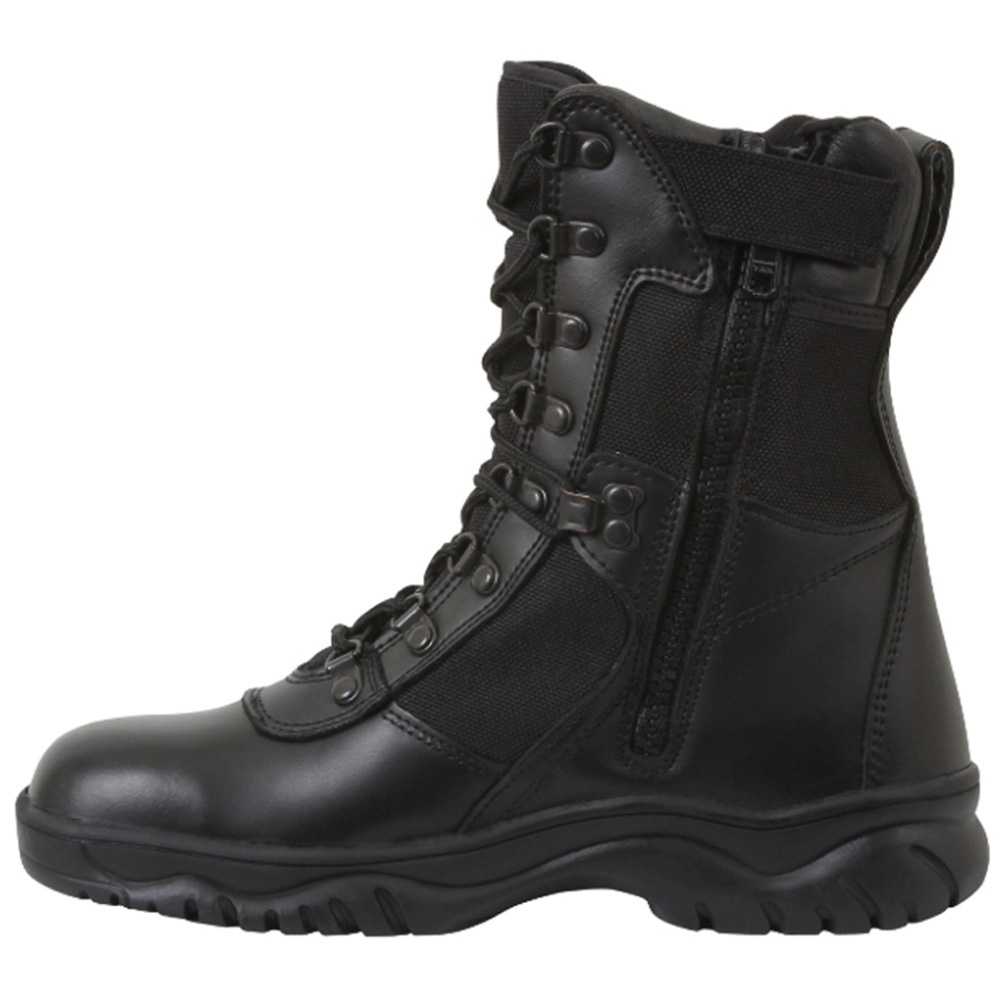 Forced Entry Tactical Boot with a zipper on the side is offered in black color. This pair of boots measures 8 inches and is offered with a variety of attractive features that include pigskin leather collar, action leather upper, full grain leather vamp, slip resistant sole, gusseted tongue with steel shank, moisture wicking lining and hardware speed laces that are rust proof. These boots are offered in sizes ranging from 5 to 15. Black Forced Entry Tactical Boot is ideal to be used on duty, while going hiking and while gearing up for combat. This footwear for men is made of finest materials and offers enhanced performance and long lasting comfort.