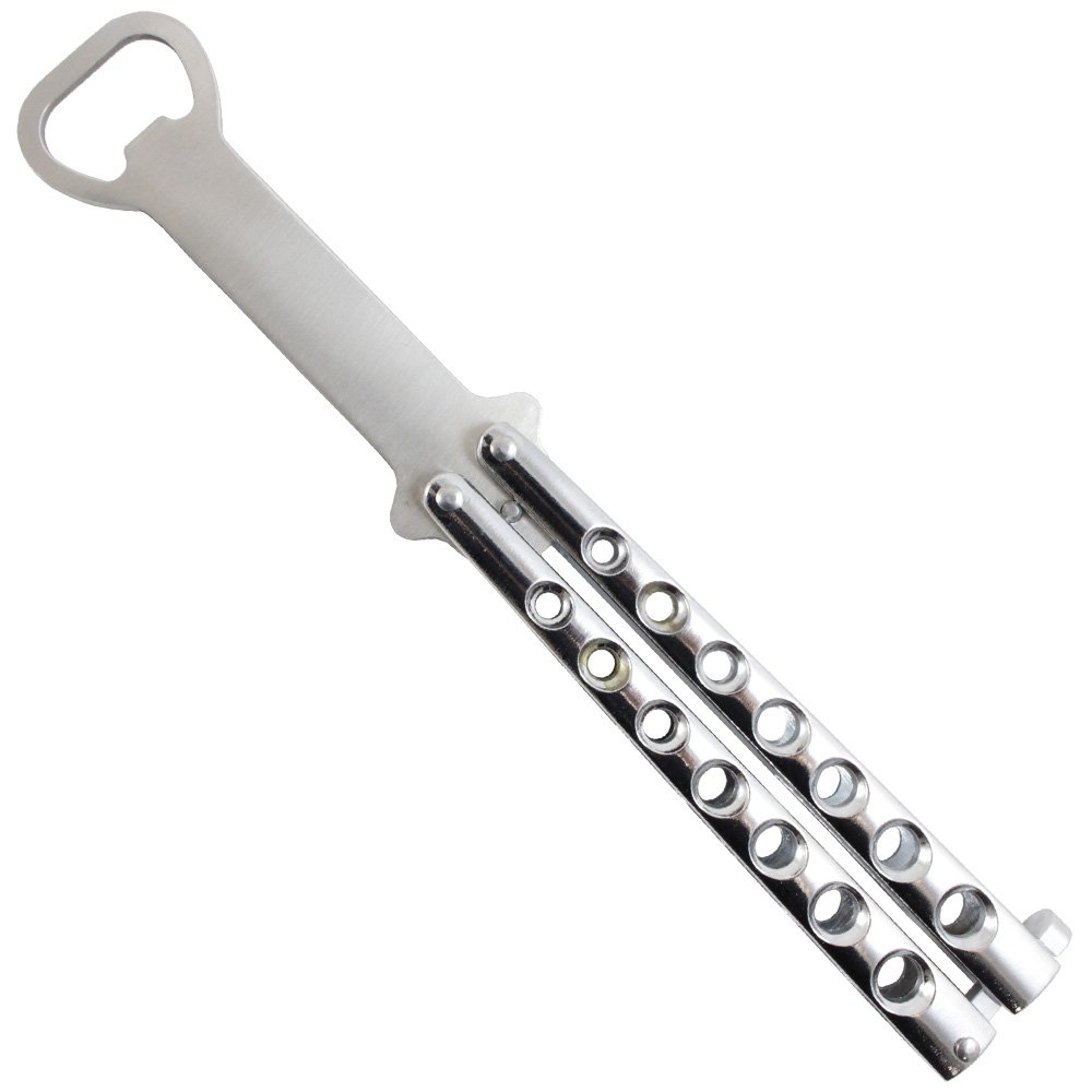 Bartending and balisong flipping go hand in hand with this Gear Stock butterfly knife bottle opener. This fully-functional balisong trainer has a full metal construction with a realistic weight and balance to practice your moves. Best of all, the blade has been replaced with a bottle opener, so you can crack open a cold one in the coolest way possible. This model features a matte black finish.