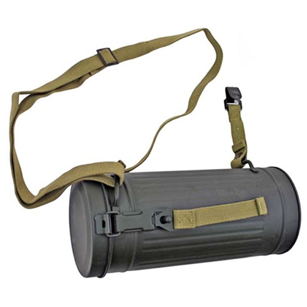 Excellent quality copy of the WWII German Gas mask Carrying Can. These are the best of the reproduction gas mask cans available: the color is good, the welds are sturdy and the design is correct. The only visible differences from originals are that the ribs aren't quite as deep and the studs that retain the straps should be fieldgray instead of dull silver, but with a little wear & tear, they look real. Field use recommendation: From personal experience I recommend wearing a gas sheet bag on the canister. By nature, these cans are noisy- they clank and rattle against the other gear and are constant source of noise pollution- which is highly undesirable in the field. The gas sheet bag may be packed with either a gas sheet, or simply an old rag, hand towel, etc.. This works wonders in silencing the rattles. The bag may be secured to the can with any type of equipment straps- both mess tin and tornister types work fine.